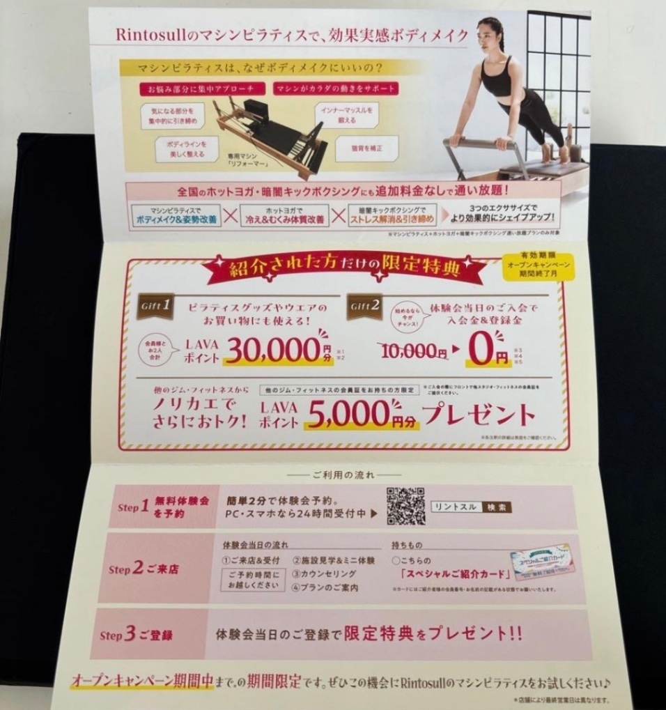 LAVAでホットヨガ、リントスルでマシンピラティスのご入会、体験を考えている方にオススメ! 体験当日このチケットをご持参頂くと、通常よりとってもお得に体験&入会ができます!