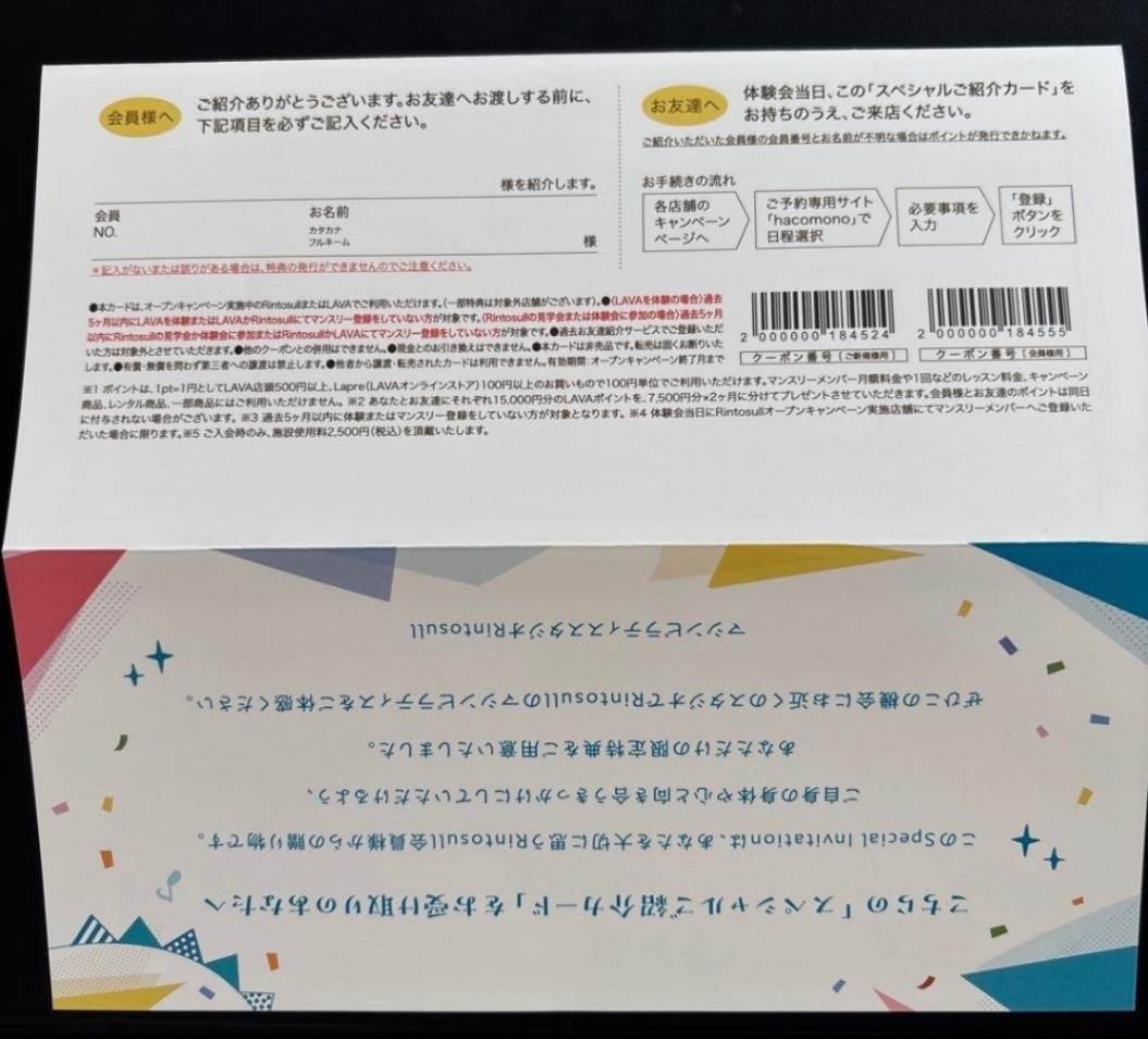 ⑥バスタオル&フェイスタオル3ヶ月無料貸出 過去5ヶ月以内にLAVAを体験またはLAVAかRintosullにてマンスリー登録をしていない方が対象です。 また過去お友達紹介サービスでご登録いただいた方は、対象外となります 詳しくはHPをご覧下さいませ。