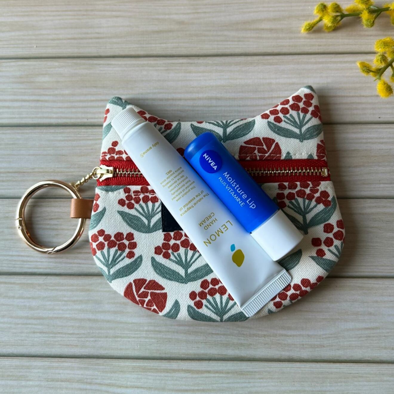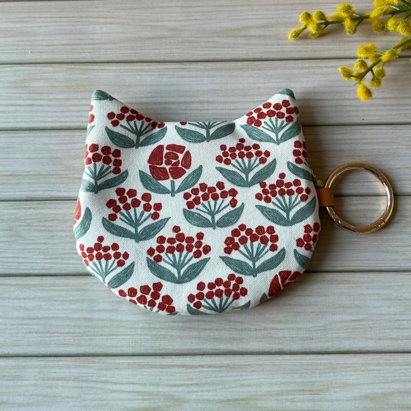 【再販】猫耳ぺたんこポーチ ミモザ柄 mimoにゃん レッド カラビナリング付き