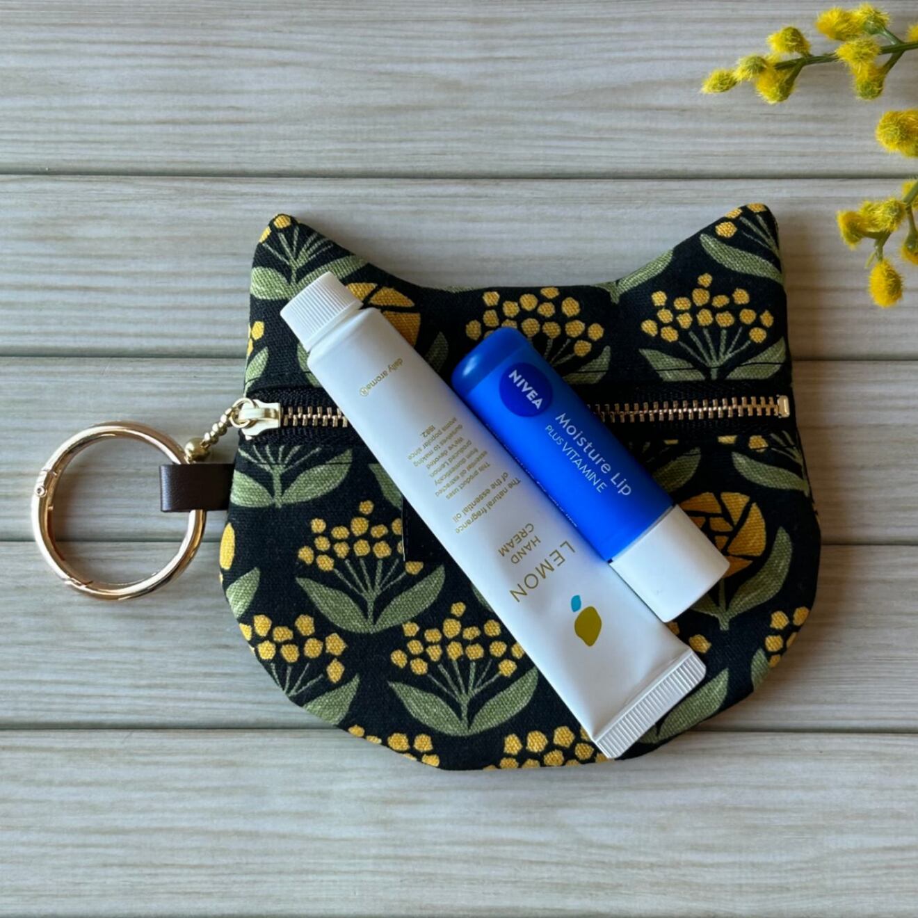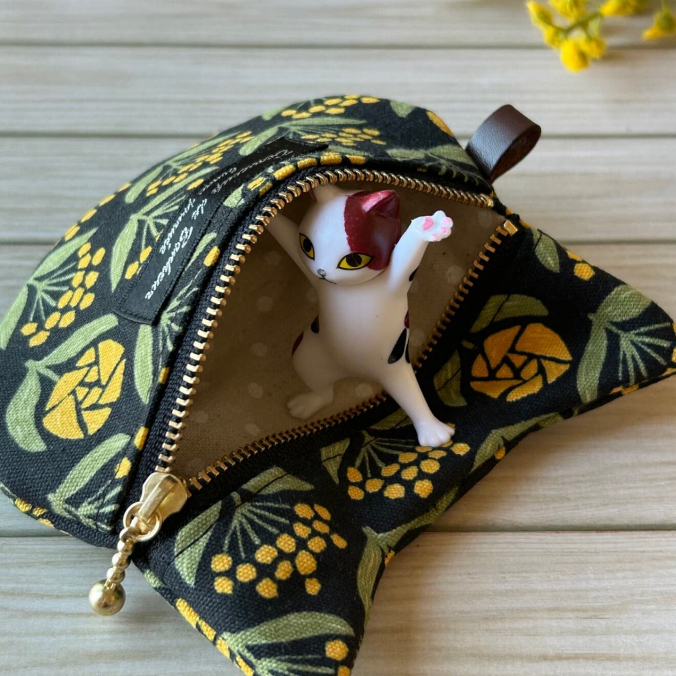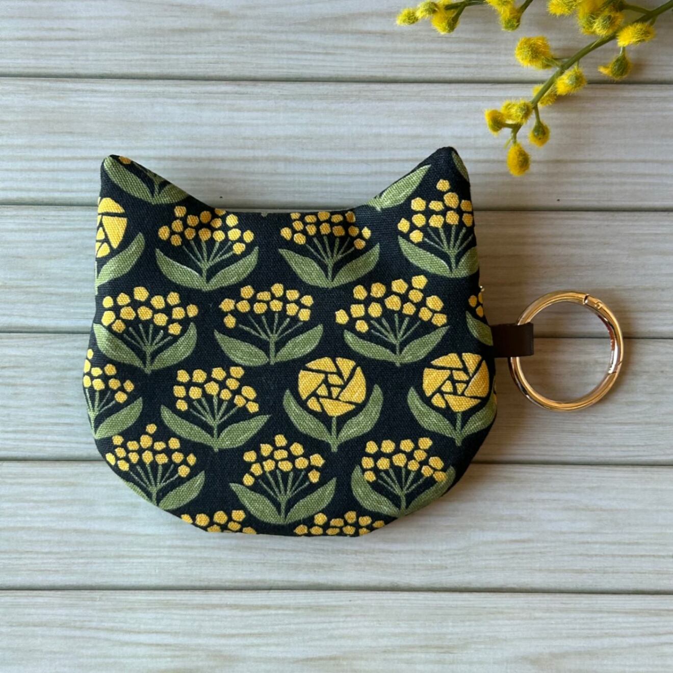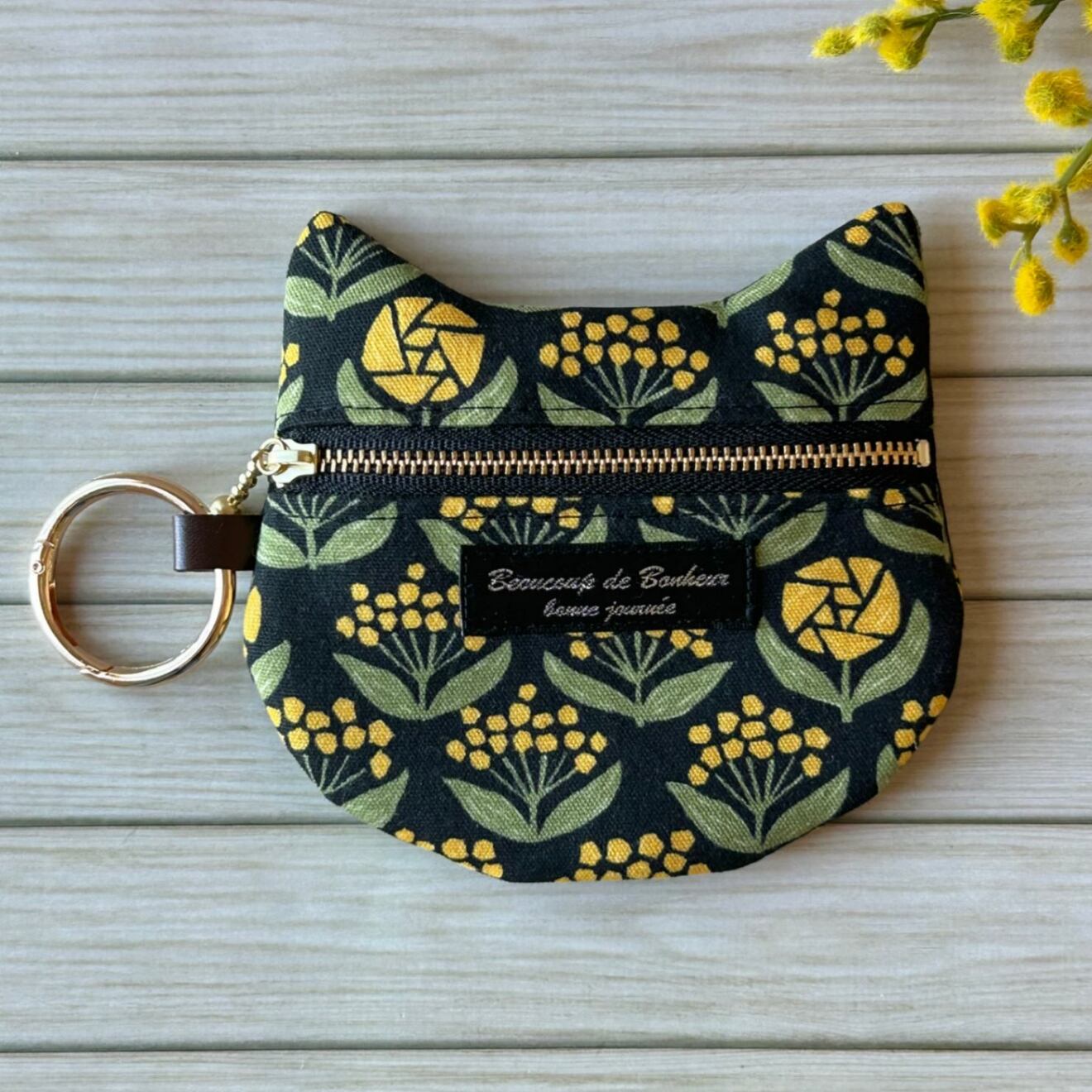 【再販】猫耳ぺたんこポーチ ミモザ柄 mimoにゃん ブラック カラビナリング付き