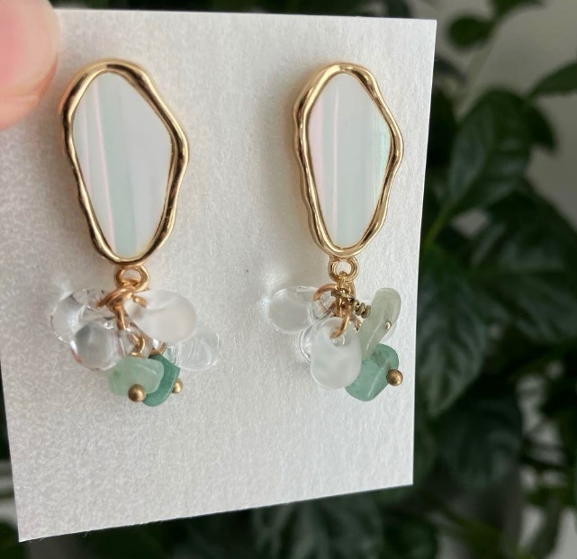 光の角度によって表情を変えるシェルと、透明感のある天然石が耳元でさりげなく揺れ、女性らしい印象を演出します。