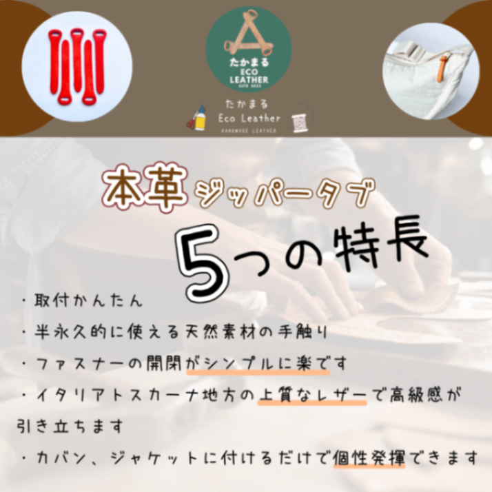 ・天然素材のタンニン鞣しを切り出し、手作業で仕上げたジッパータブです。