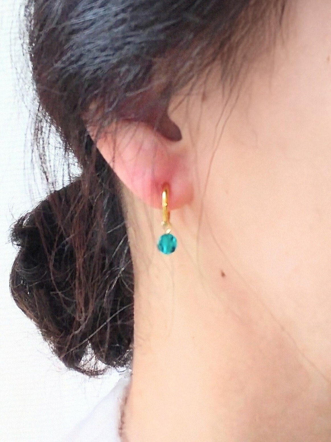 スッキリとしたデザインで、ピアス見えするフープイヤリングに一粒をあしらうことで、