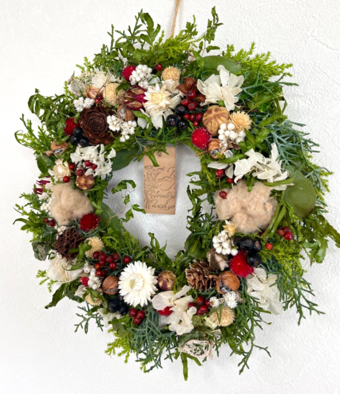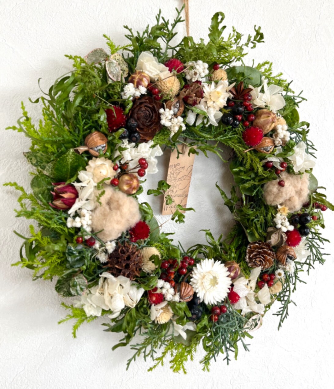 ユーカリやブルーアイス、ゴールドクレストなどの爽やかなグリーンをベースに、沢山の種類の木の実・綿花・紫陽花・千日紅・ヘリクリサムなどさまざまな素材を贅沢にあしらいました。