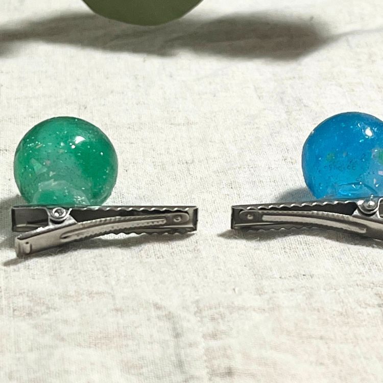 ペリドットのような緑のレジンのボールがついたヘアピンです。