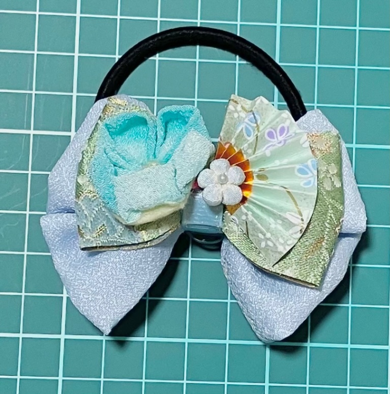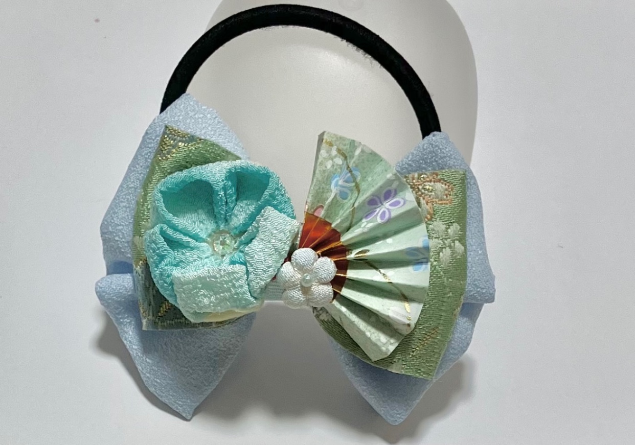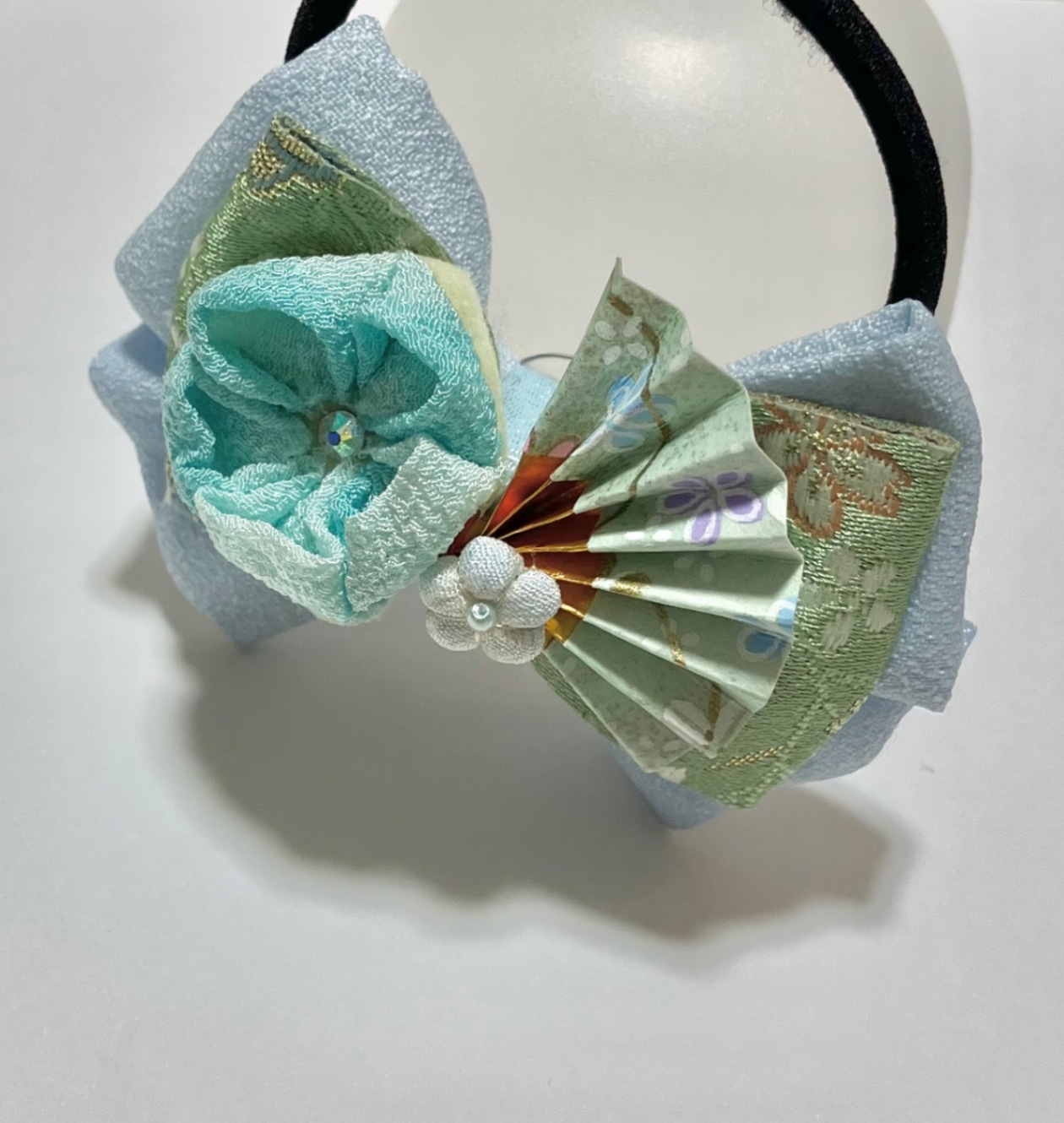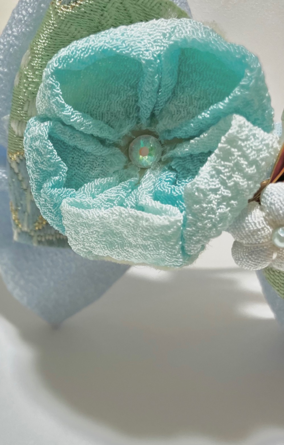 淡いミントグリーンと水色の色合わせが爽やかに映える、和風ヘアアクセサリーです。