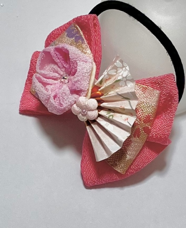 ちりめん生地と金襴リボン、つまみ細工の真ん中部分にはキラキラと輝くスワロフスキー使用し、自信のある上質な作品になっております!
