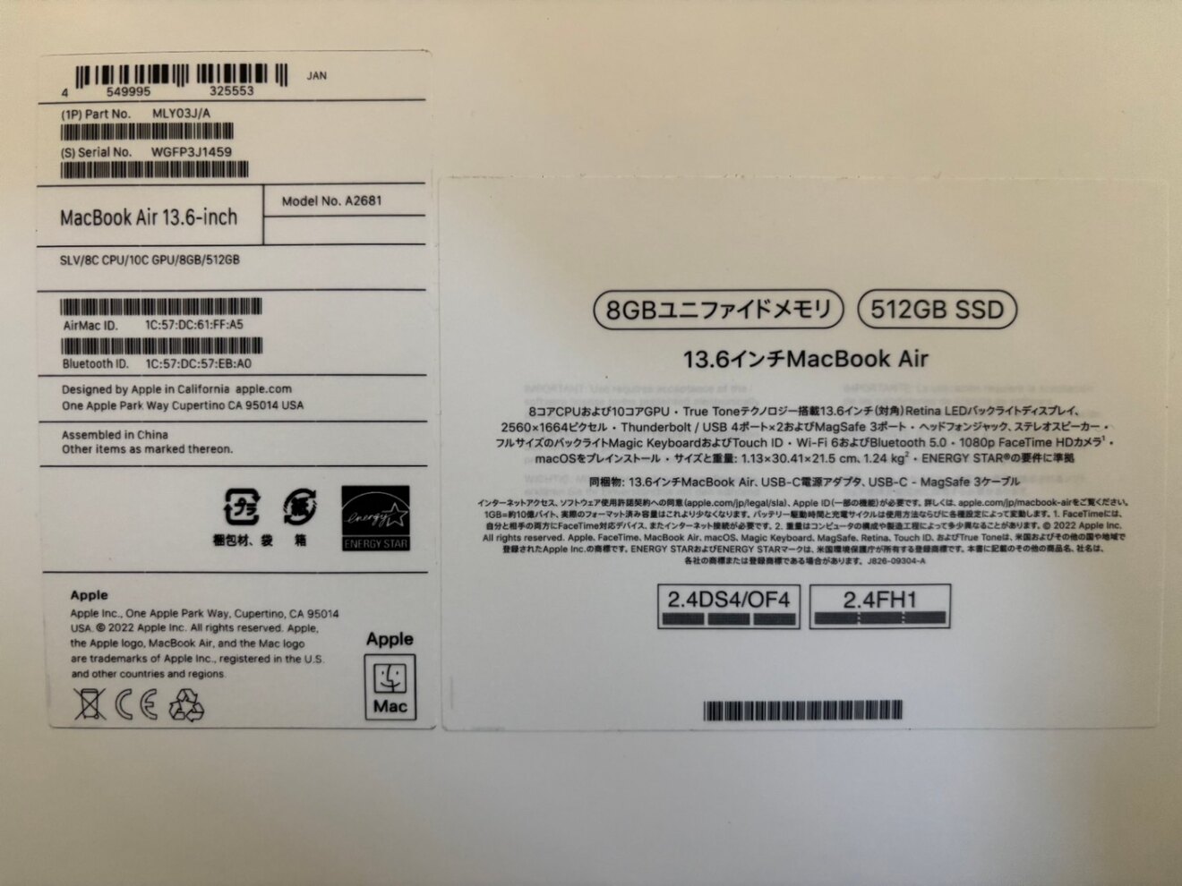 MacBook Air(M2)13.6インチ メモリ8GB・SSD512GB