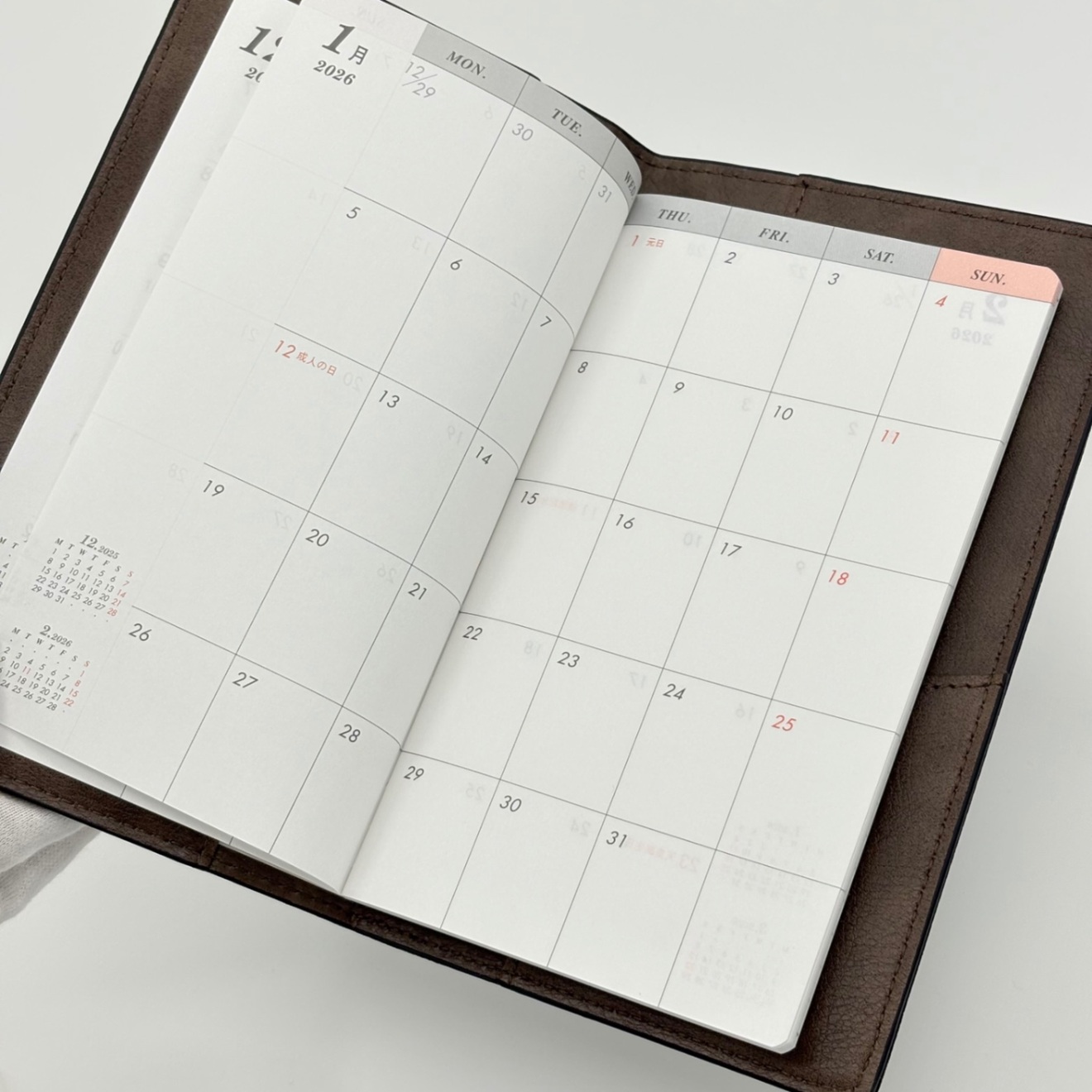 手帳はマンスリーブロックタイプで、2025年12月〜2027年3月まで同じ書式でページがあります。