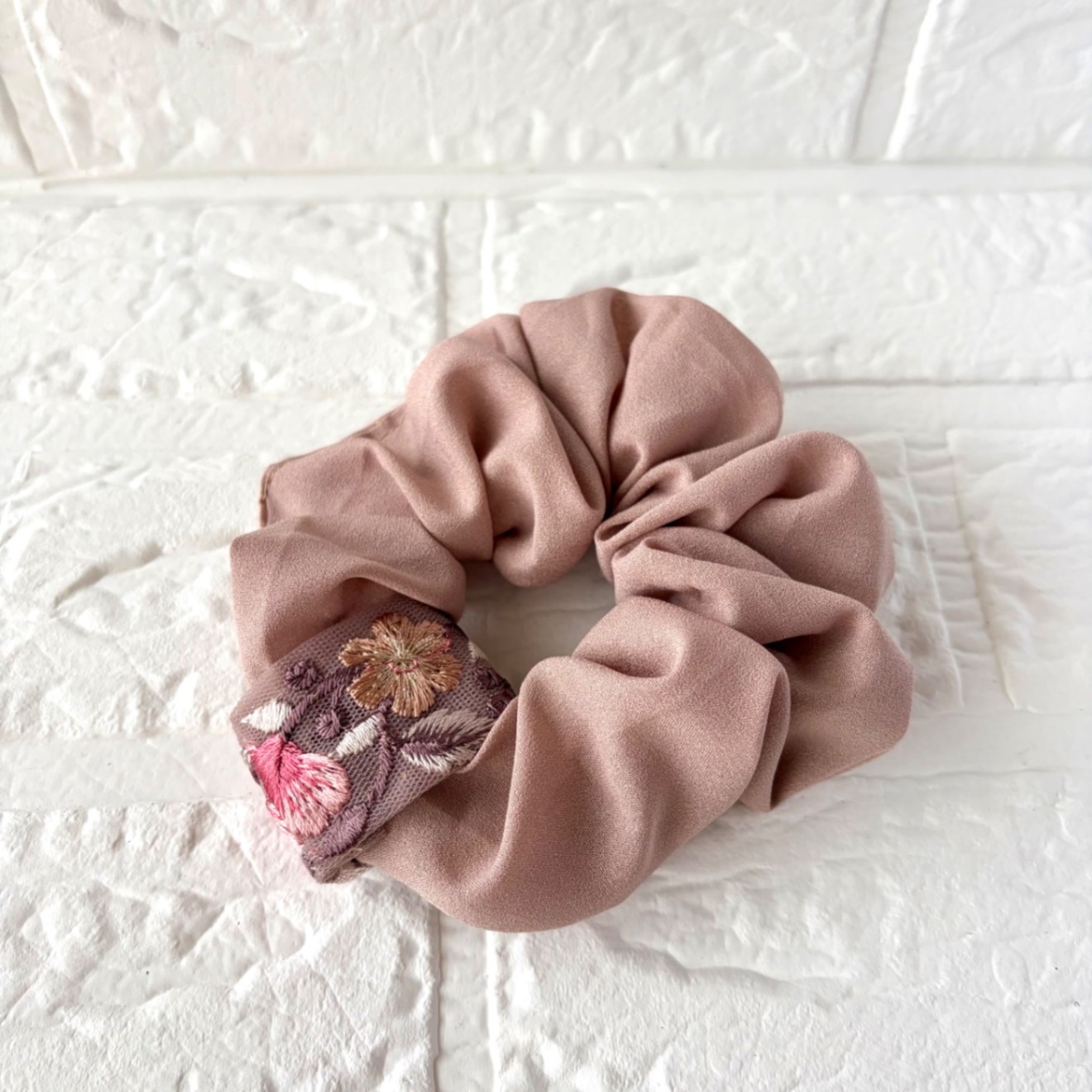 薄いチャコールグレーのオーガンジー風生地に、インド刺繍リボンがあしらわれたシュシュです。