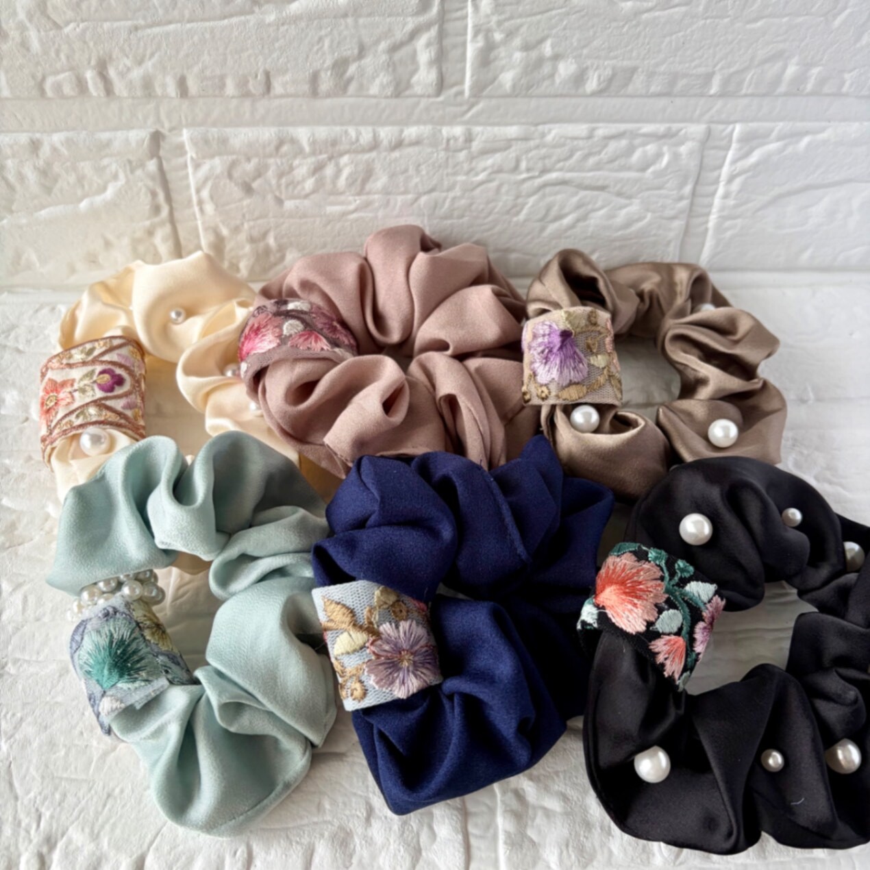 インド刺繍リボン🎀シュシュ 薄いチャコールグレー