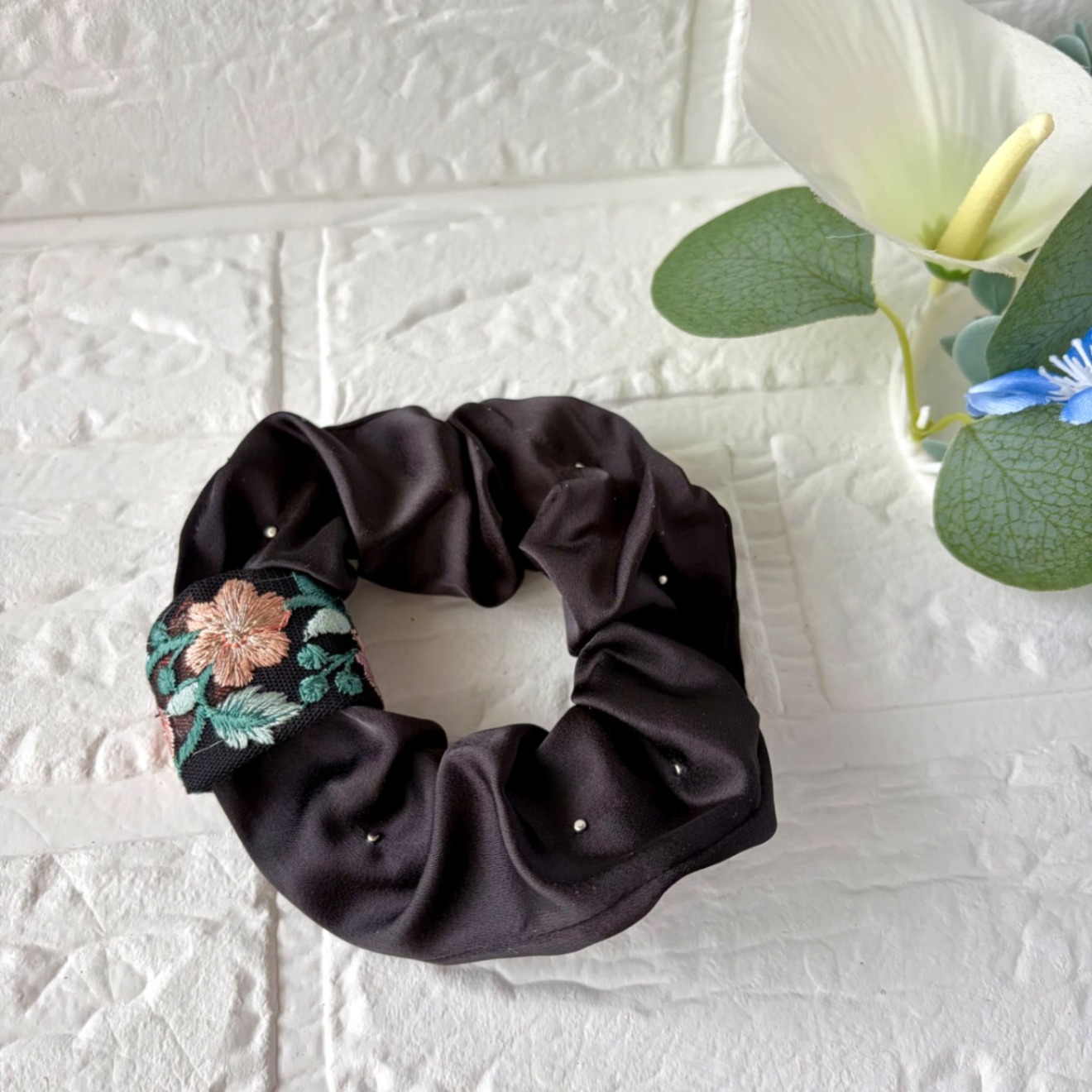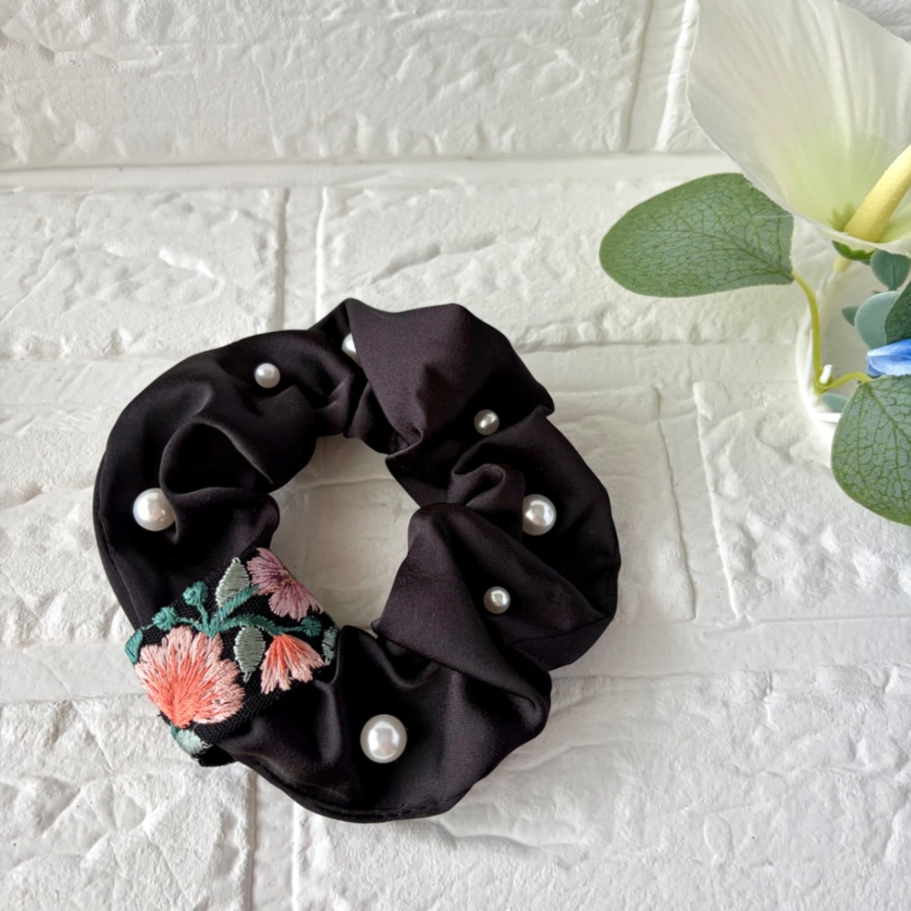 ブラックの光沢のあるサテン風生地に、パールとインド刺繍リボンがあしらわれたシュシュです。