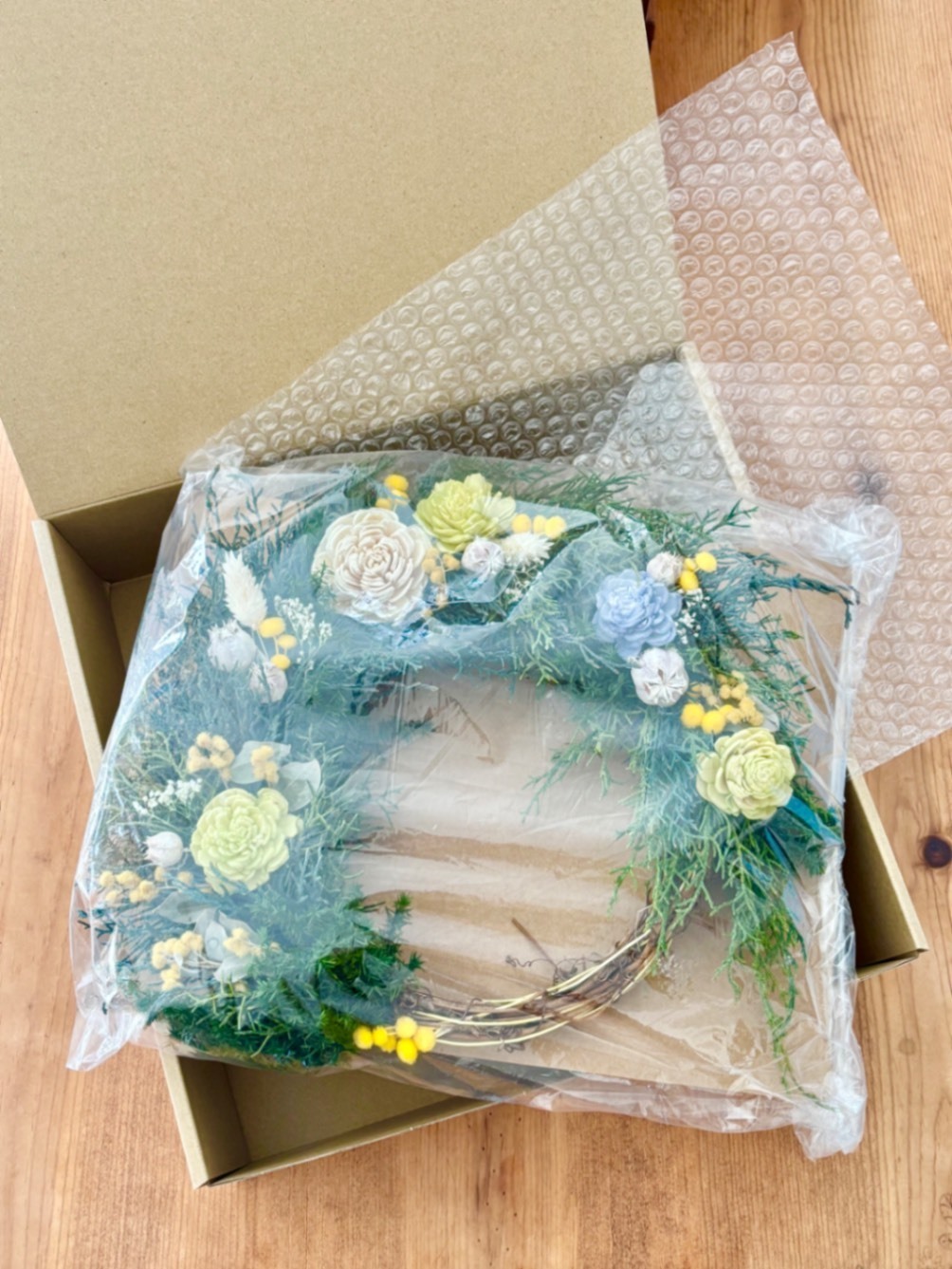 リースの形を崩さないよう、ビニールと緩衝材で丁寧に保護&箱内で動かないように固定して発送致します。
