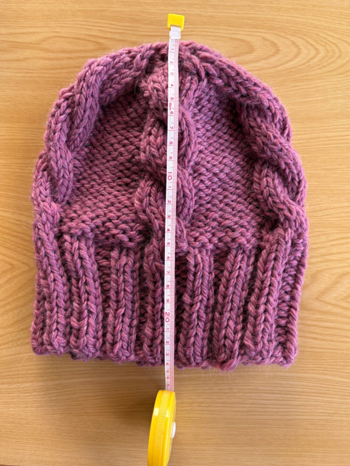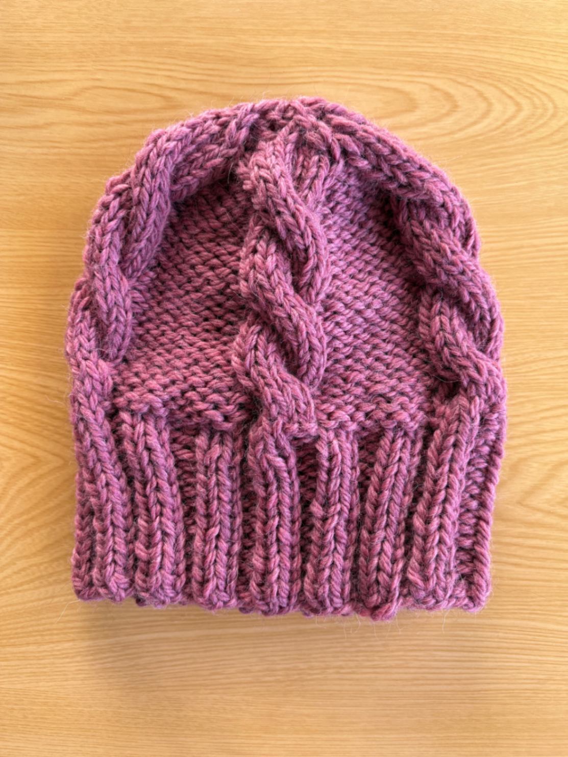 こちらは、ケーブル模様が印象的な手編みのニット帽です。