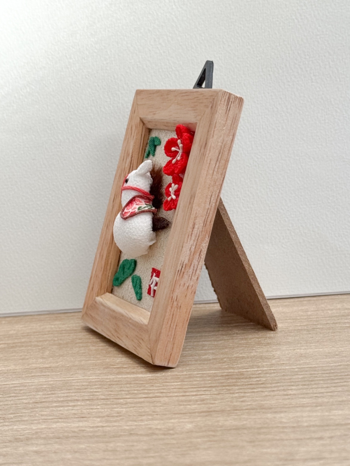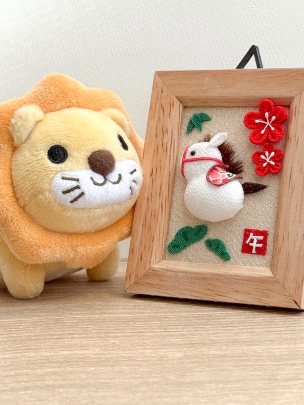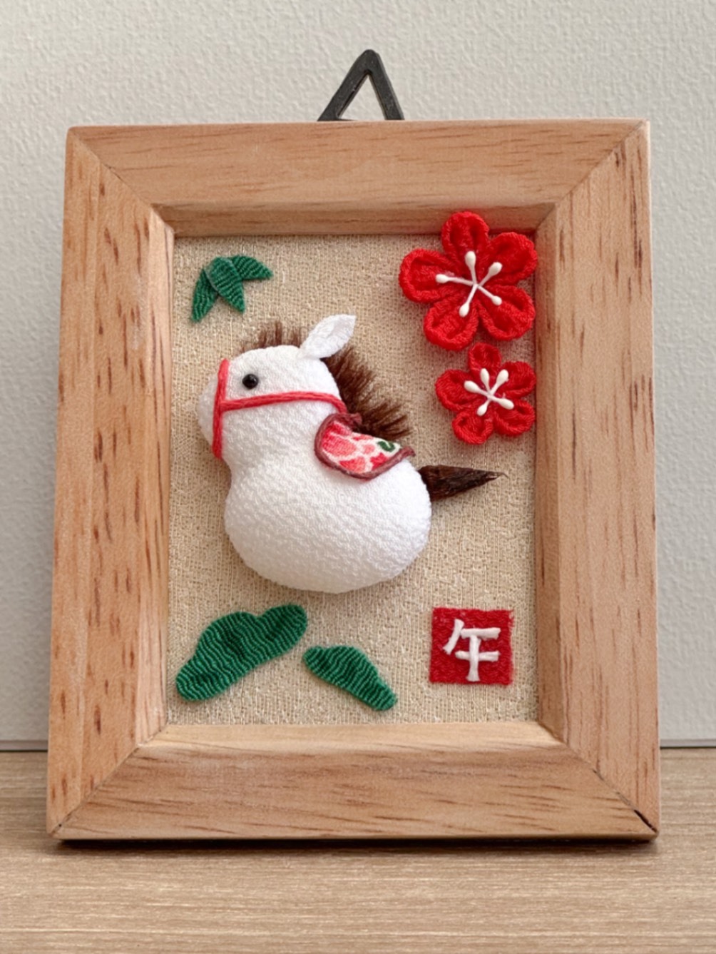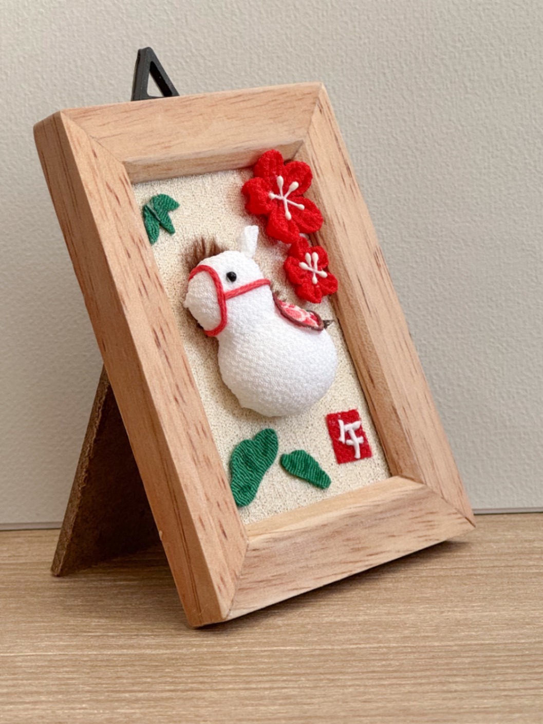 ころんとした白い馬を、ちりめん細工で仕立てた干支「午(うま)」モチーフのフォトフレームです🐎✨