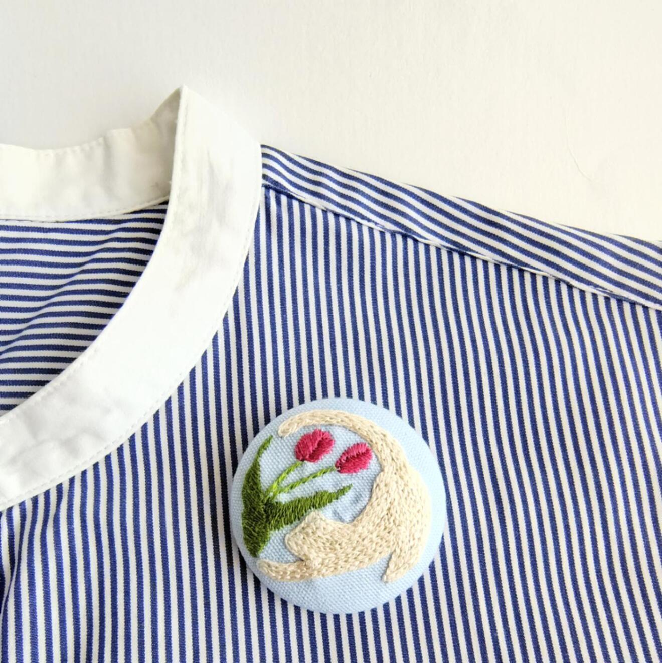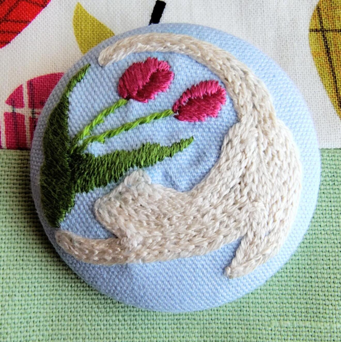 【素材違い・テスト版】伸びをするネコの手刺繍ブローチ*チューリップ