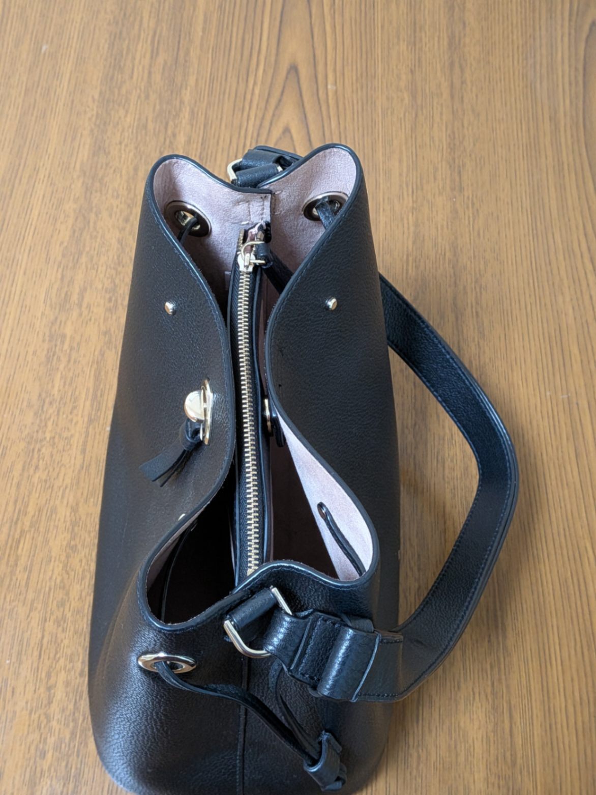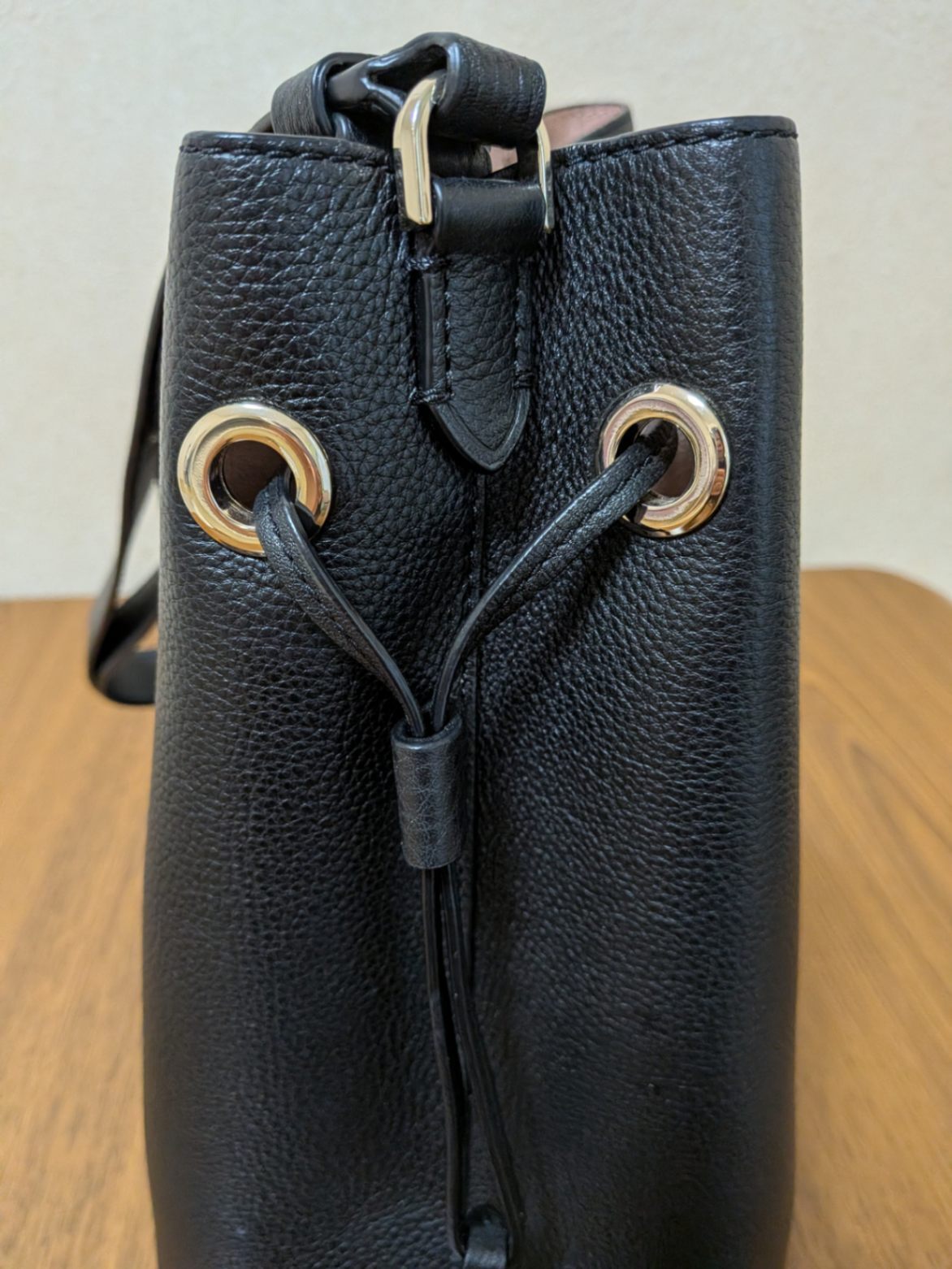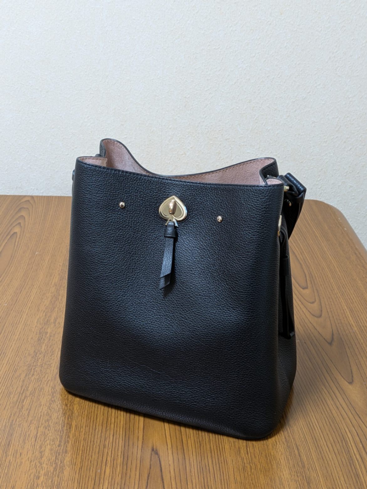 ケイト・スペイドバケツ型ブラックトートバッグ、調整可能なショルダーストラップ付き。