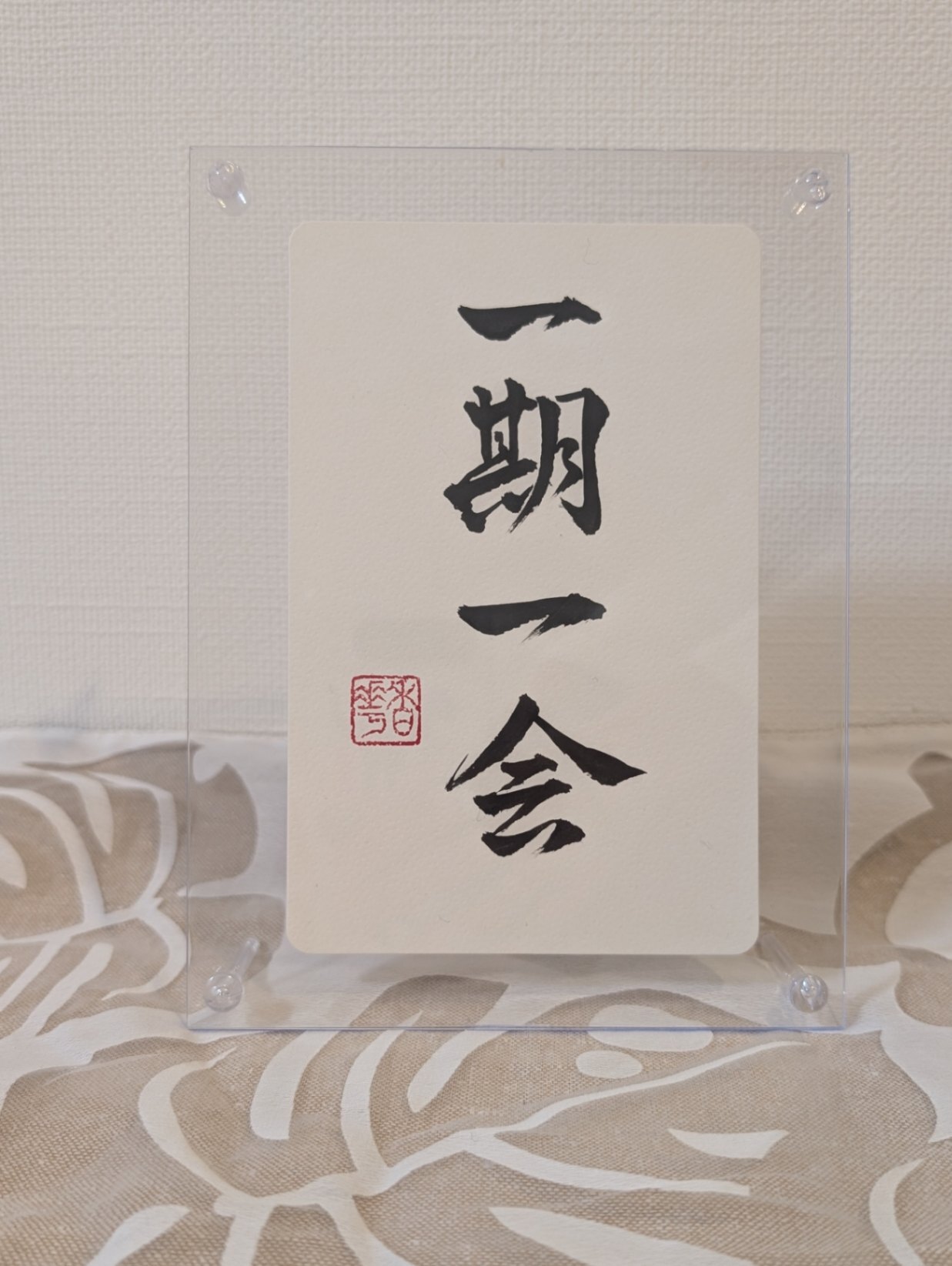 一生に一度限りの機会。人との出会いや、その瞬間を二度とない大切なものとして誠実に向き合う、という願いを込めて揮毫いたしました。