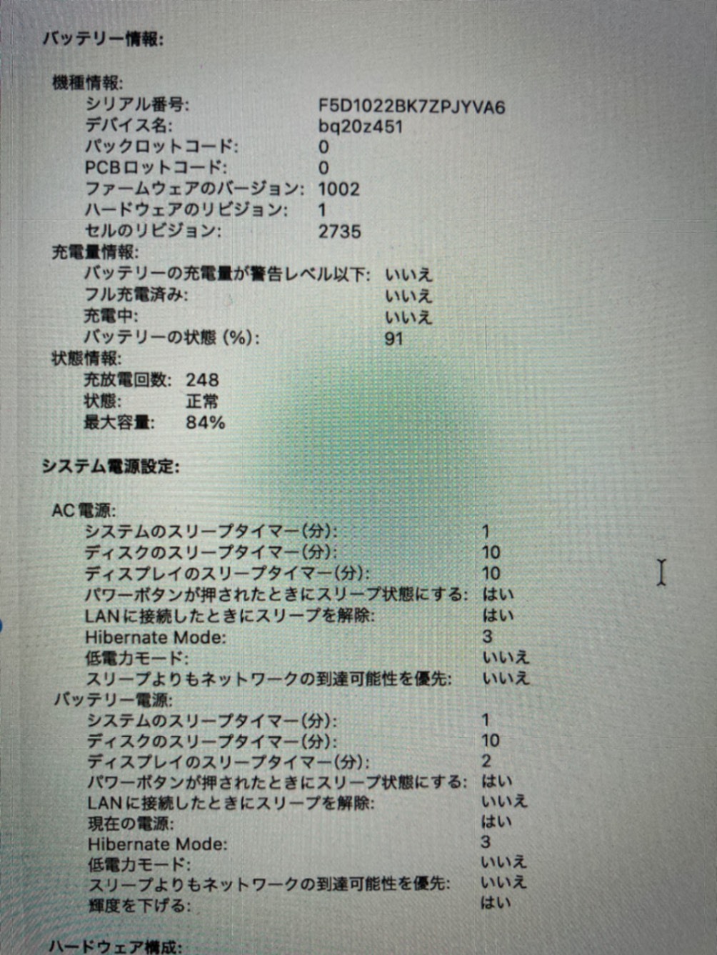・バッテリー状態:正常(最大容量84%)、充放電回数248回