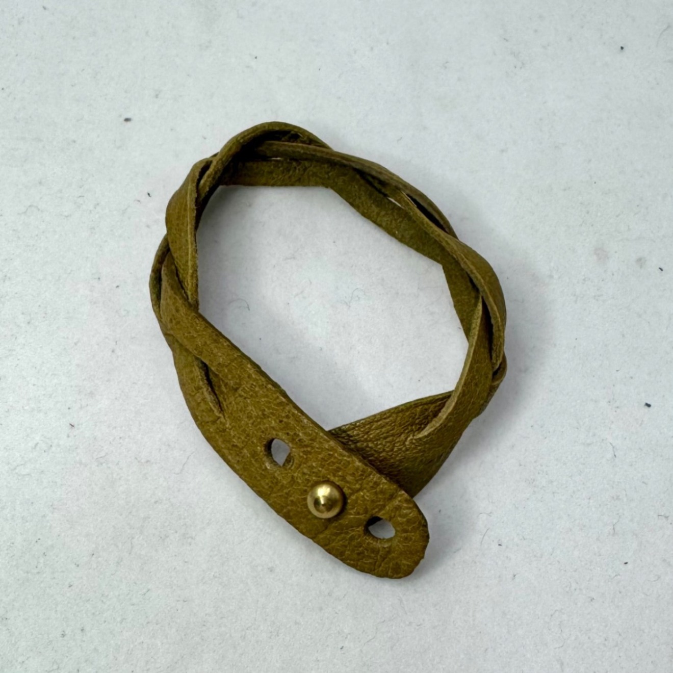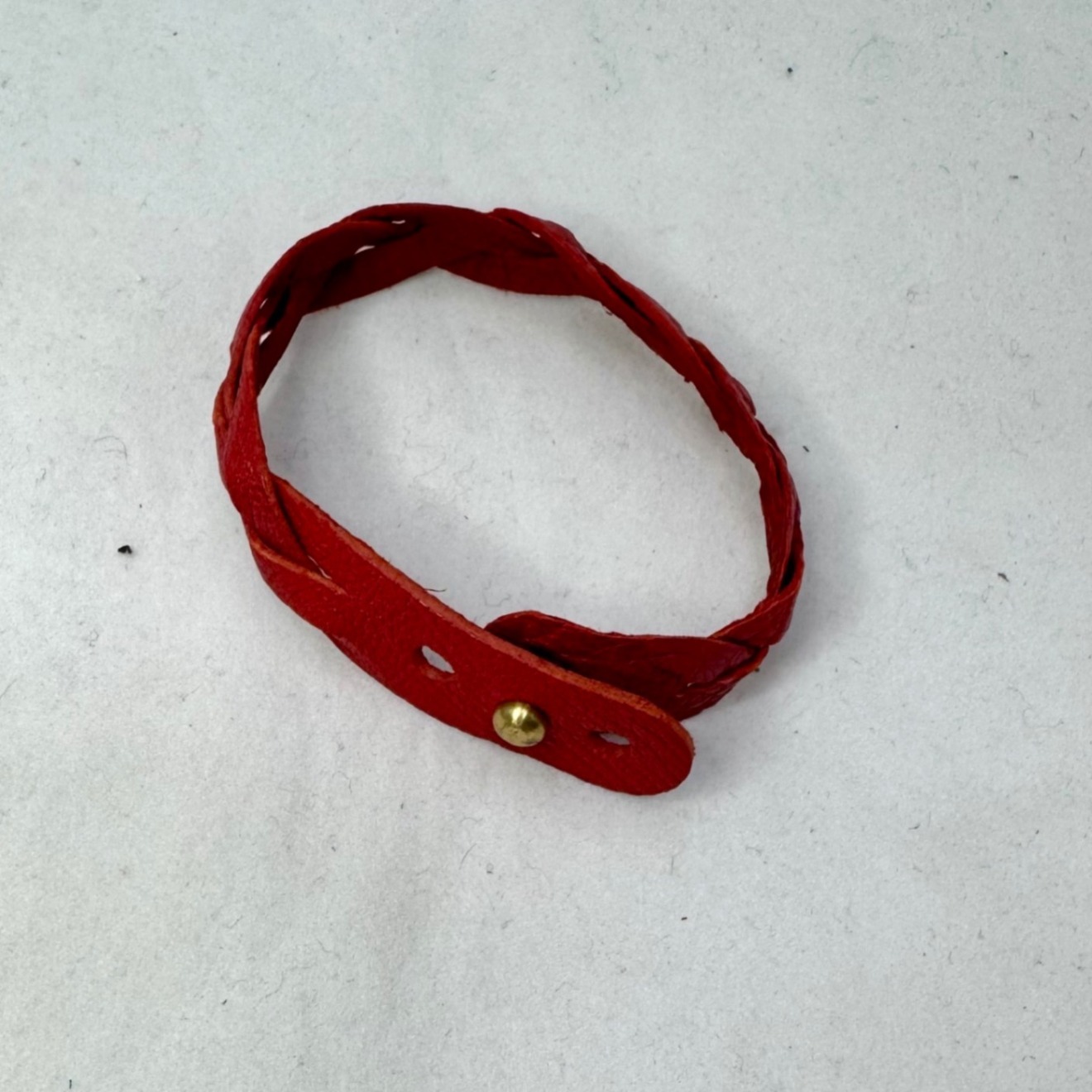 赤・緑・キャメルの3色の鹿革で編み込んだブレスレットです😊