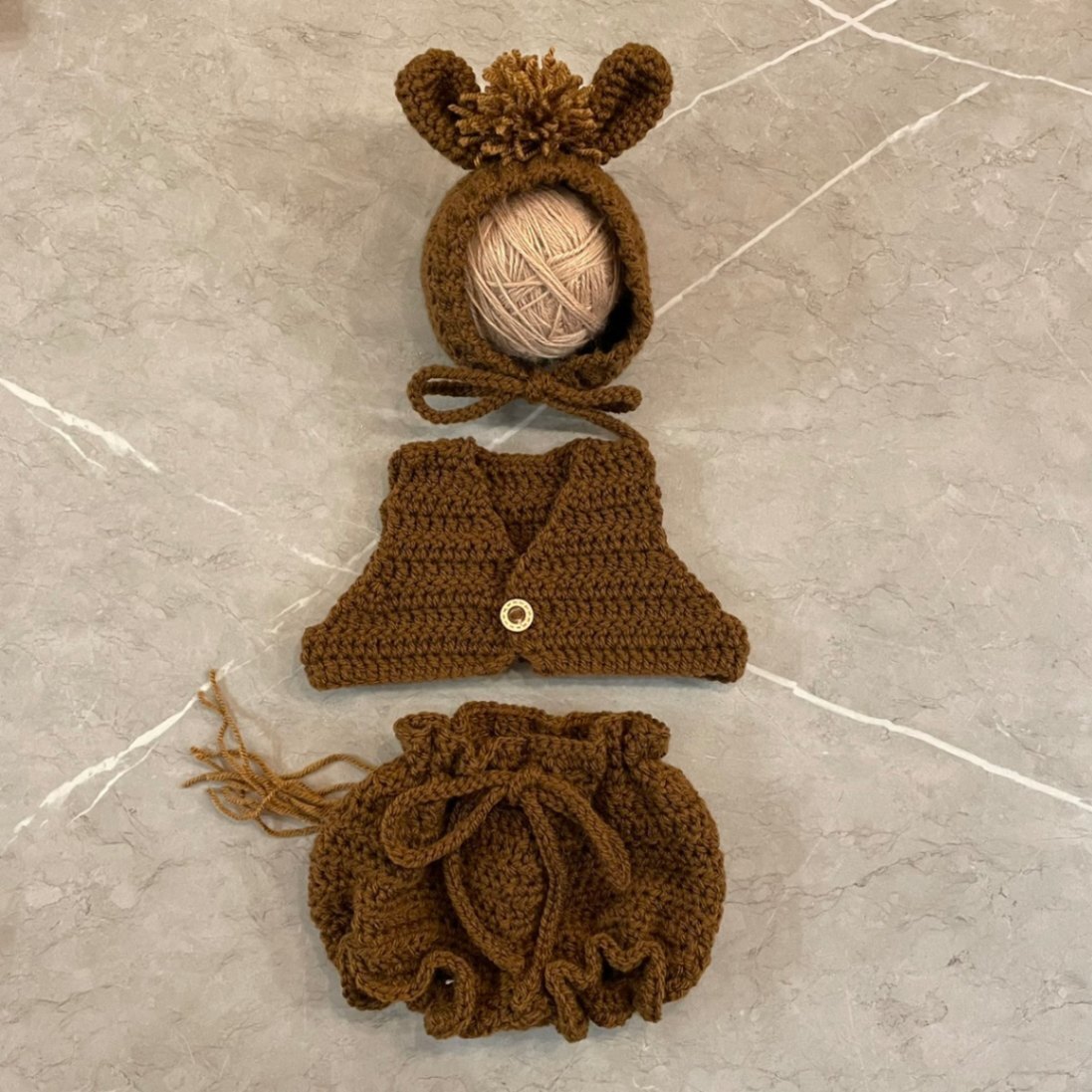【ニューボーンフォト】手編み うまコスチューム3点セット(ブラウン)/ ベビー衣装 出産祝い