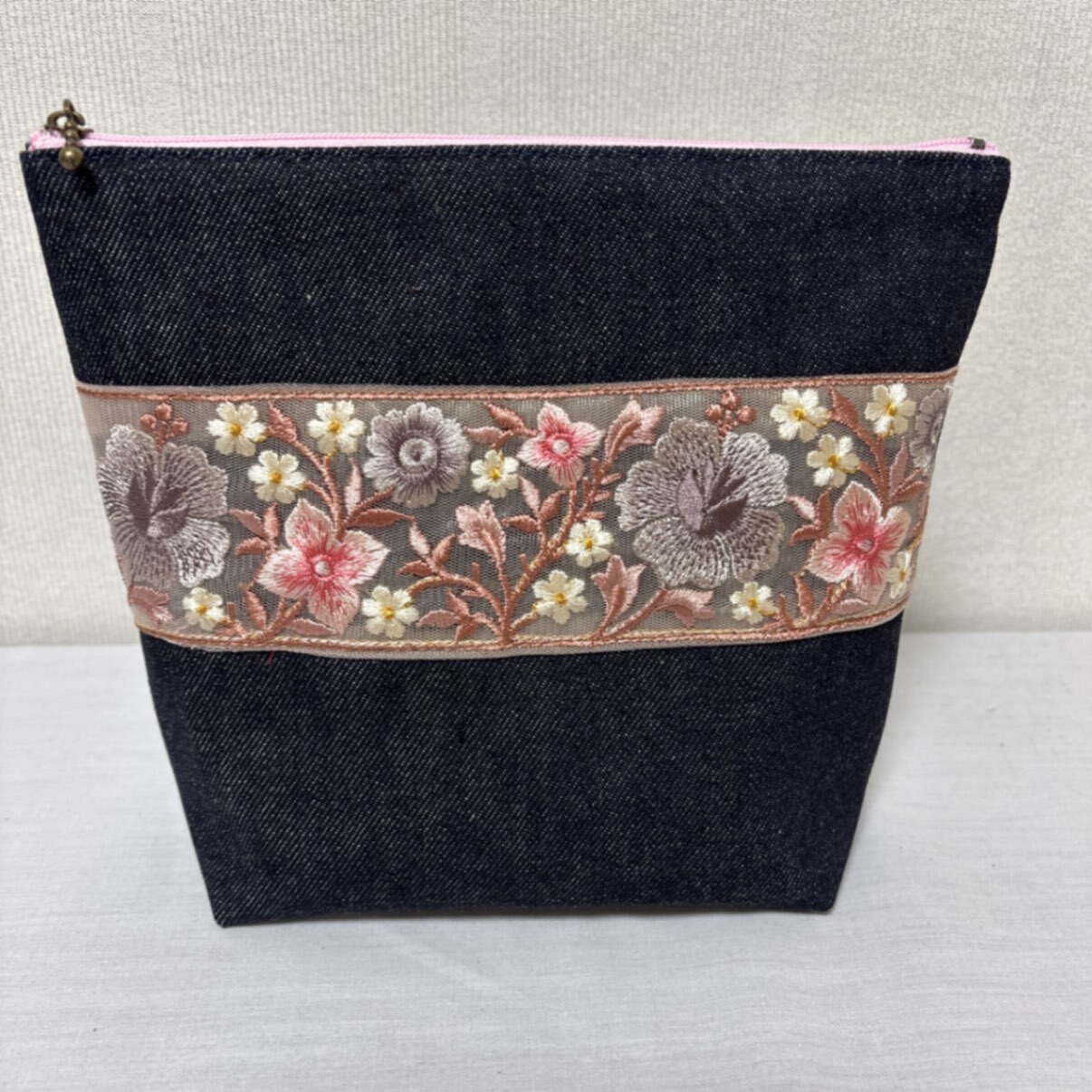 ハンドメイド】デニム × インド刺繍リボン ポーチ 大人可愛い / 一点物
