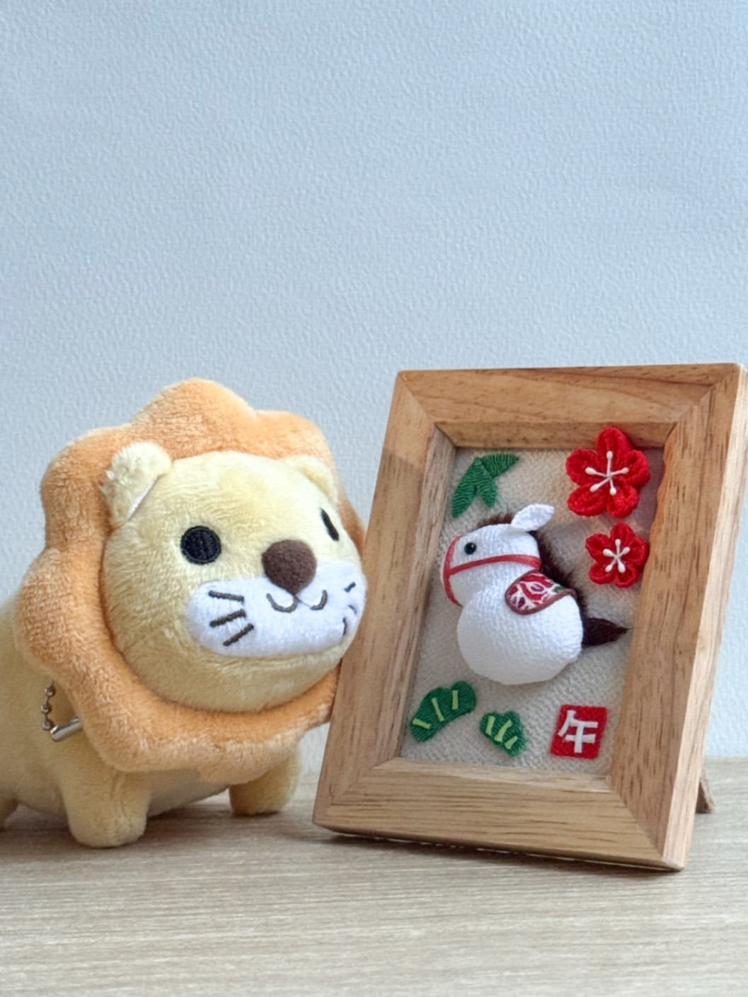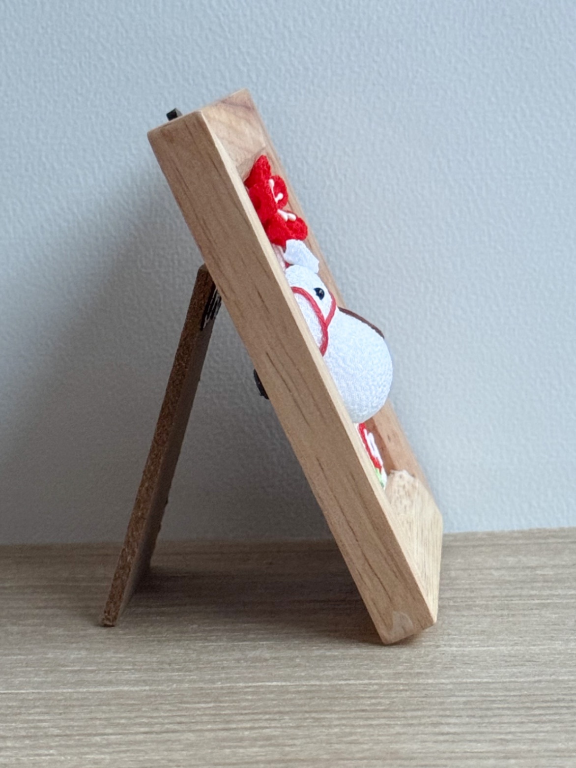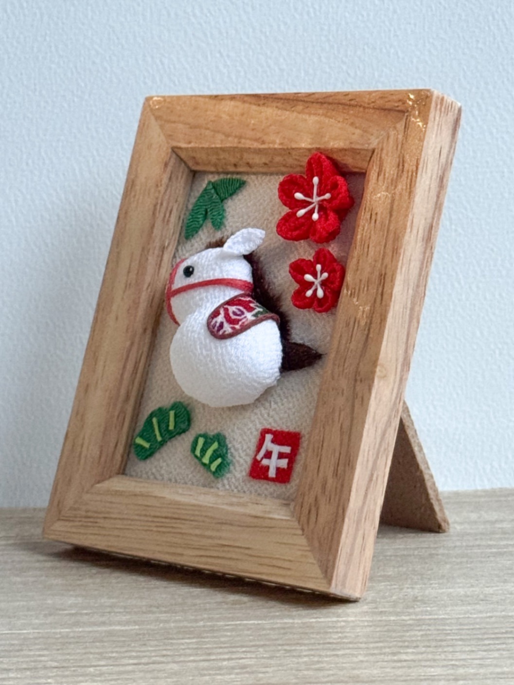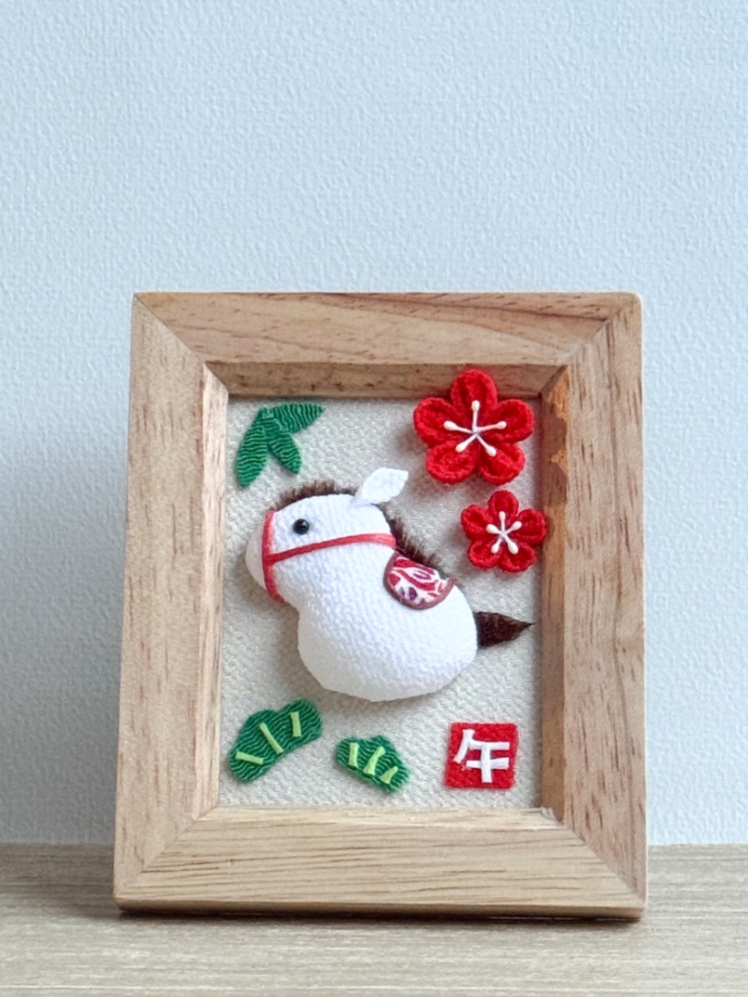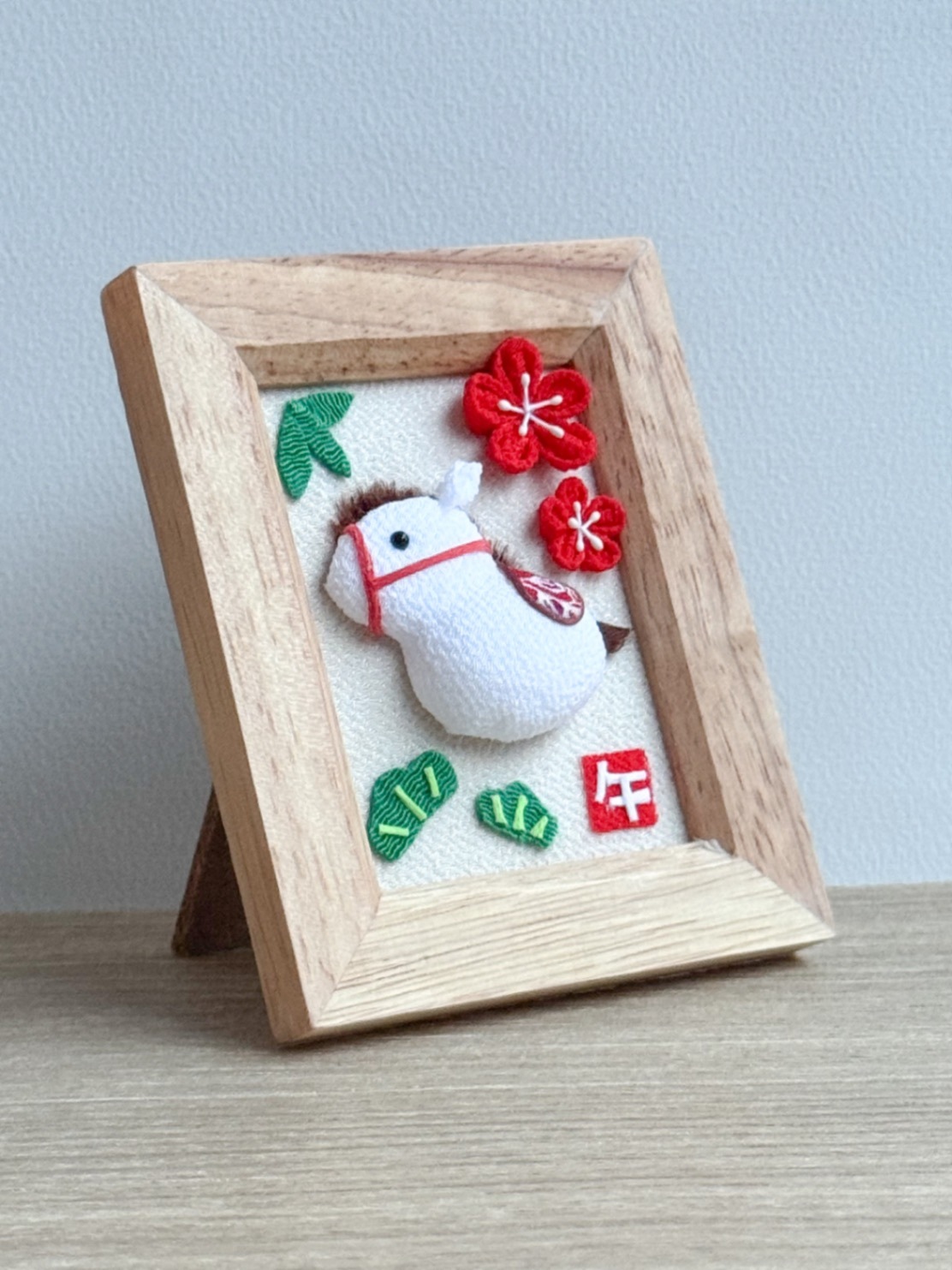 ころんとした白い馬を、ちりめん細工で仕立てた干支「午(うま)」モチーフのフォトフレームです🐎✨