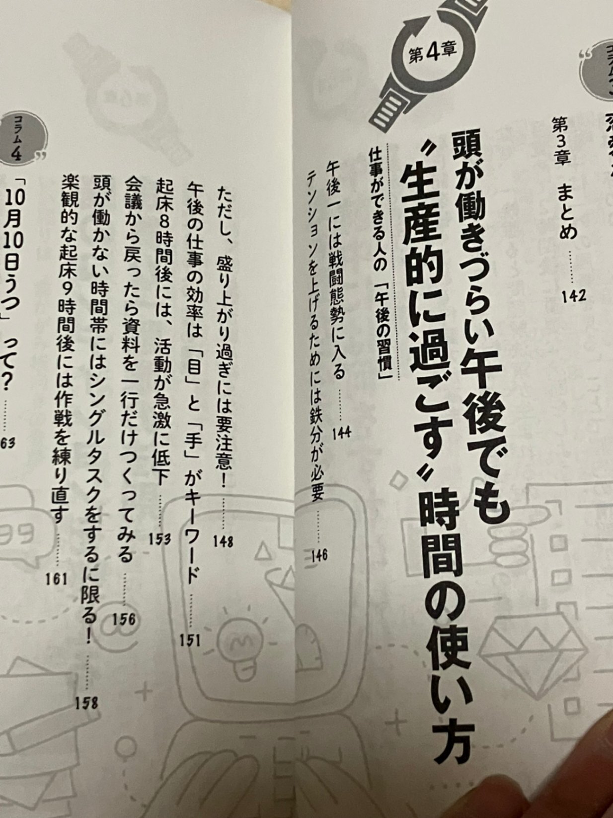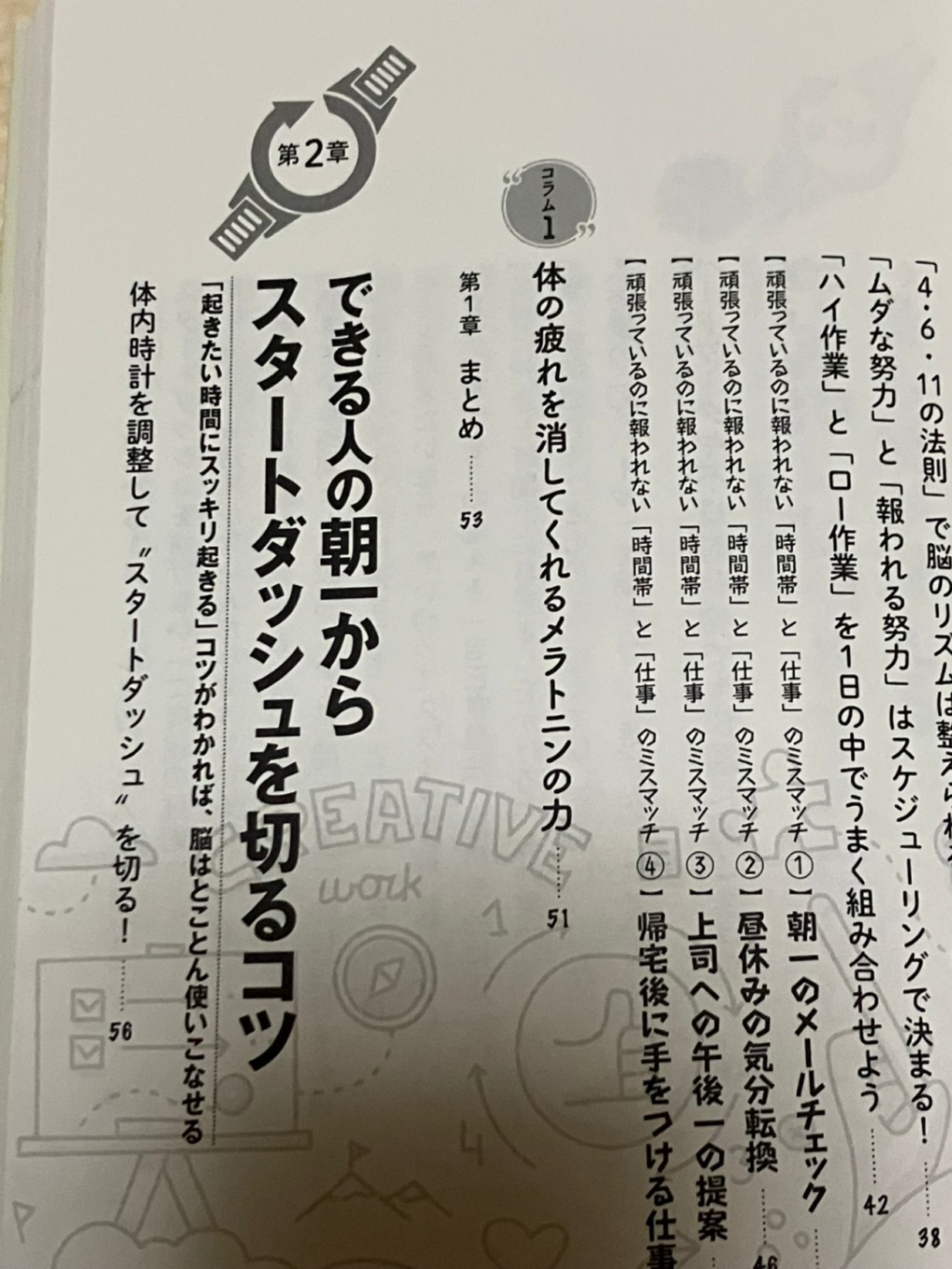 ・睡眠・仮眠・光の浴び方・休憩の入れ方を工夫しながら、自分の脳のリズムに合わせた一日の設計図をつくることで、がんばりに頼らずにパフォーマンスを最大化する方法を示した一冊となっている。