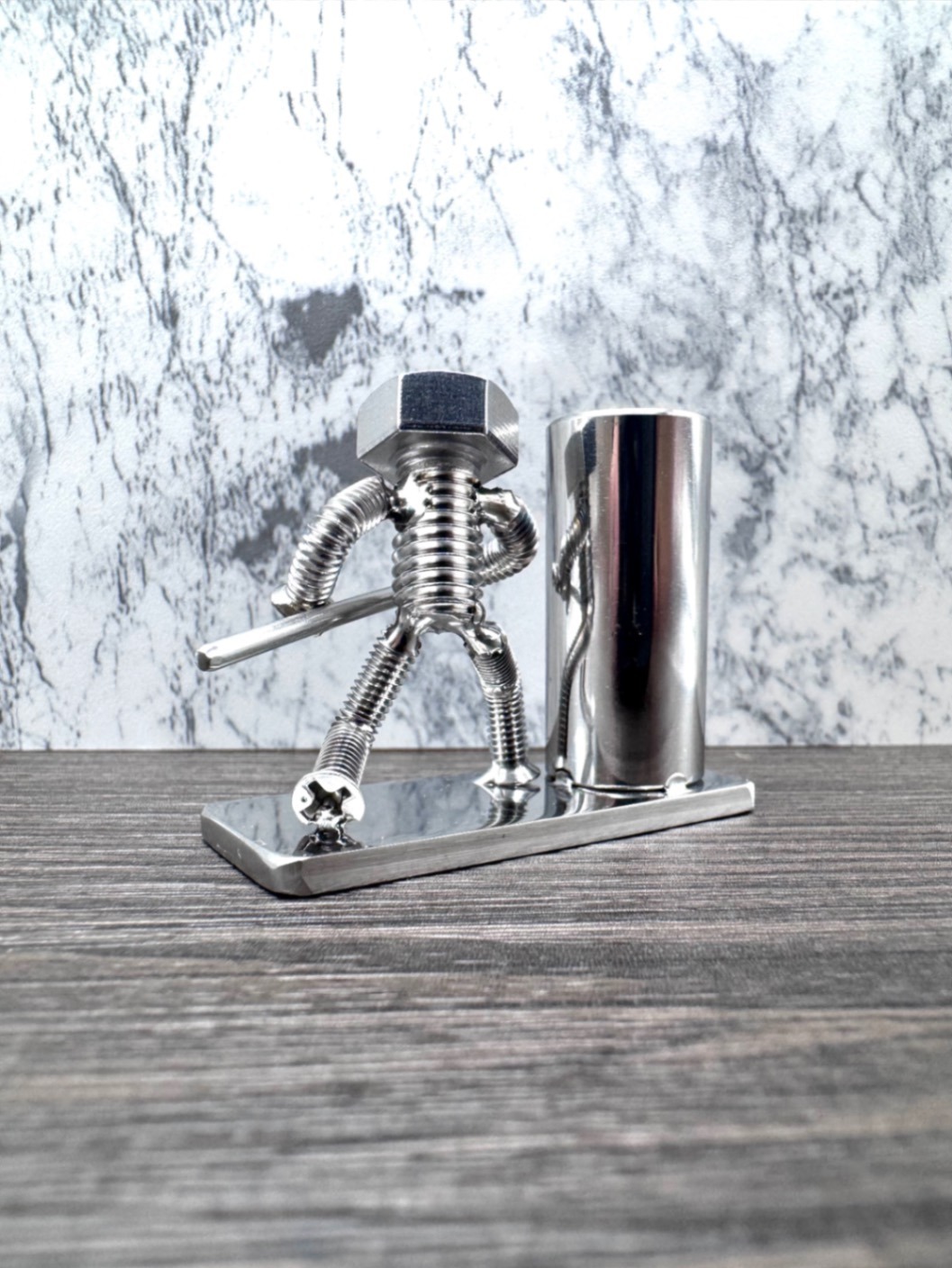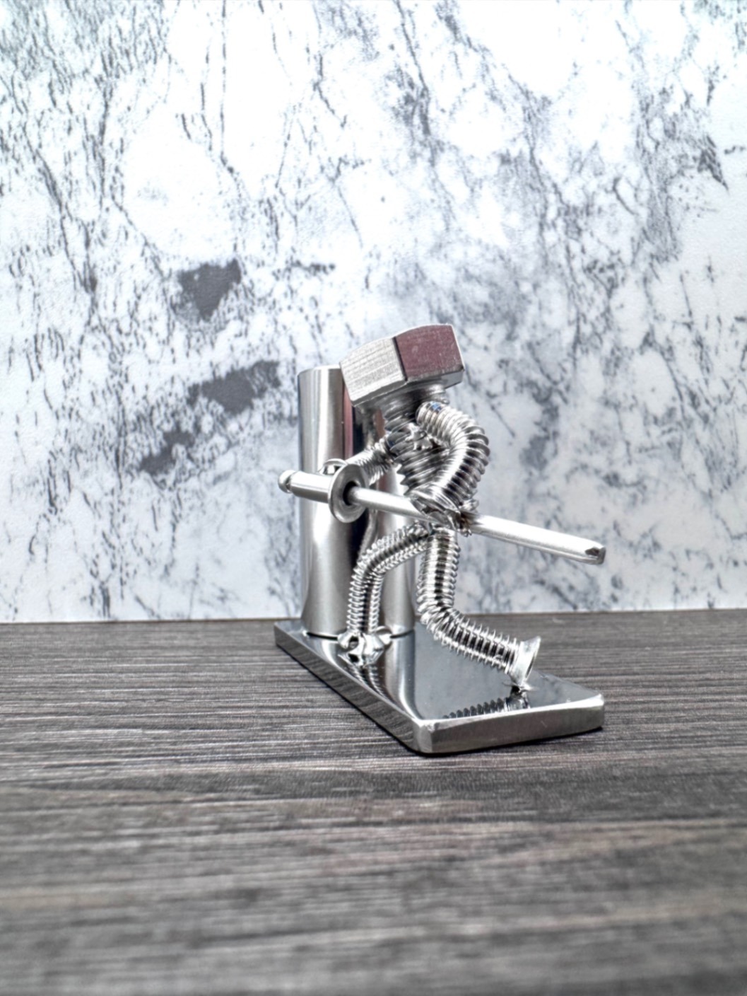 この作品は、SUS304ステンレス製のボルトやナット、パーツを丁寧に組み合わせて作られたハンドメイド作品。インダストリアルな素材感と、ちょっぴり可愛いフォルムのギャップが魅力です。