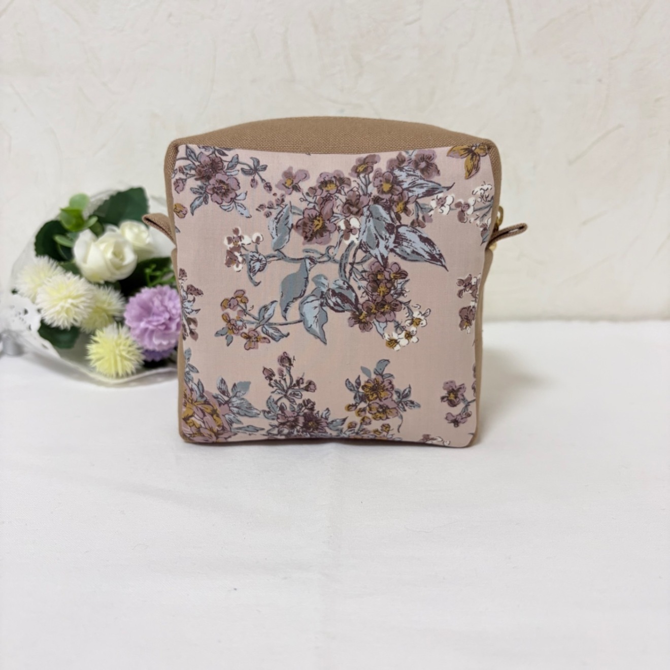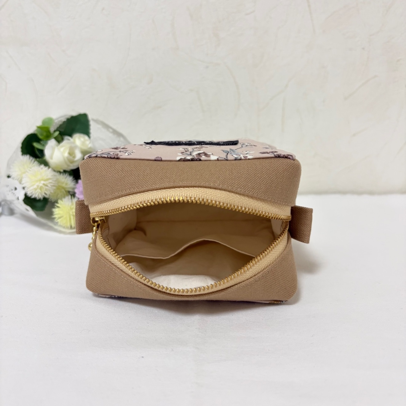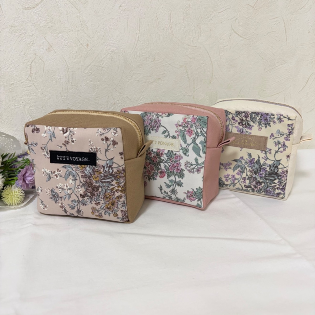 繊細な花々が咲き誇るリバティプリント「セリーヌ(ウォールナッツ)」を主役に、上品なポーチに仕立てました