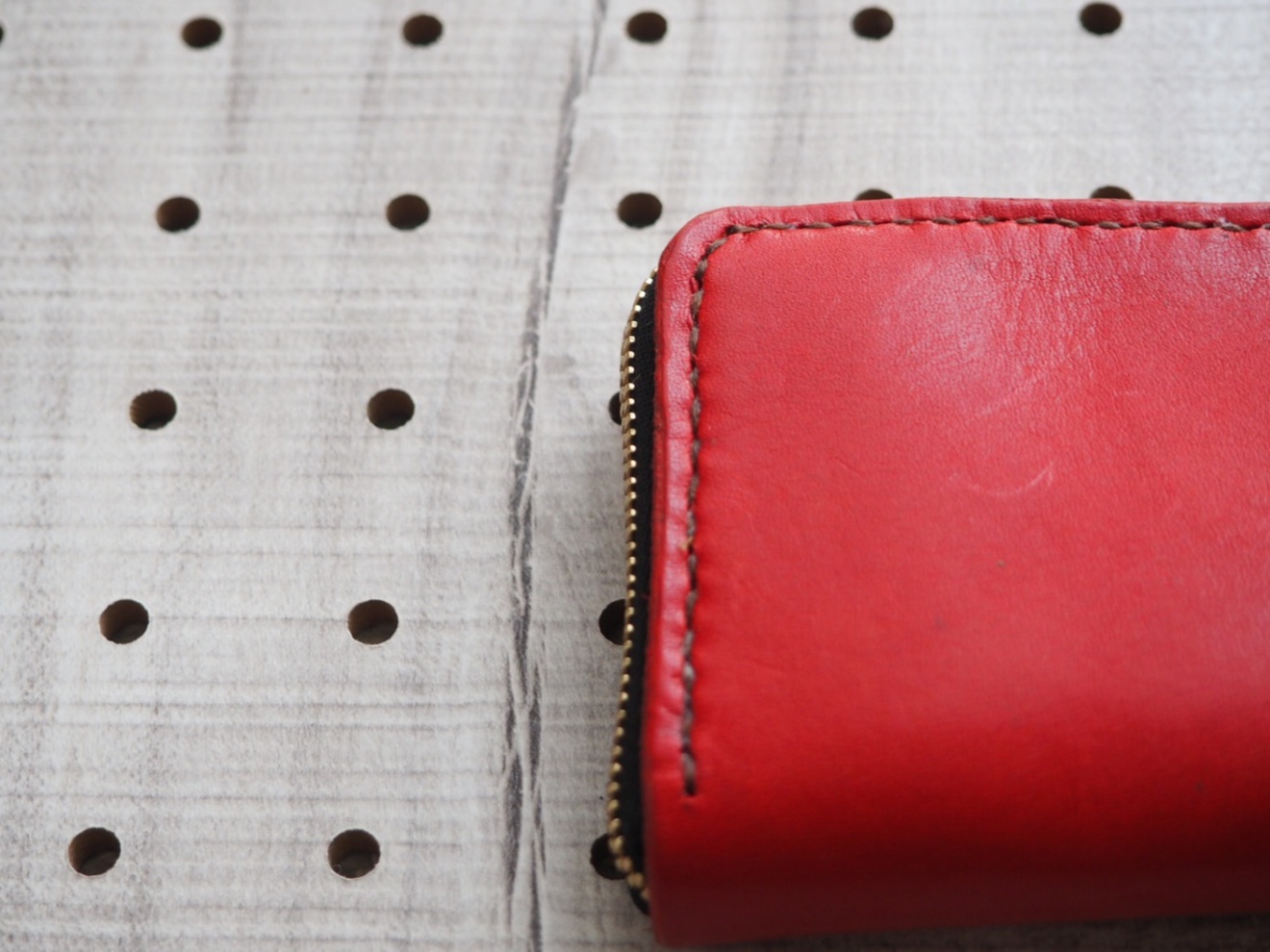 赤いレザー製のコインケース、3つのカードスロット付きで実用的。