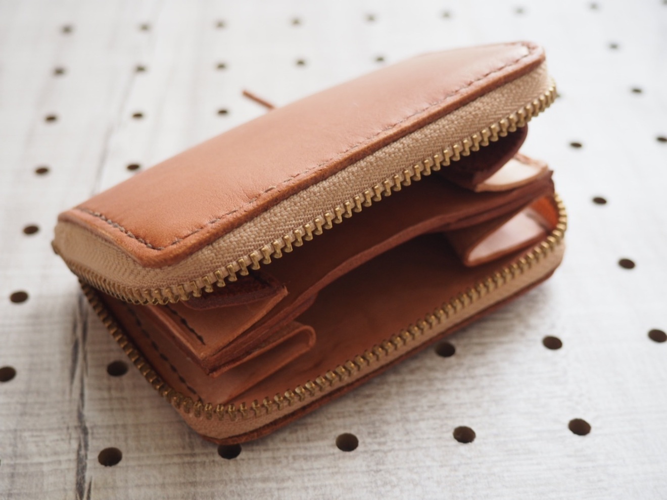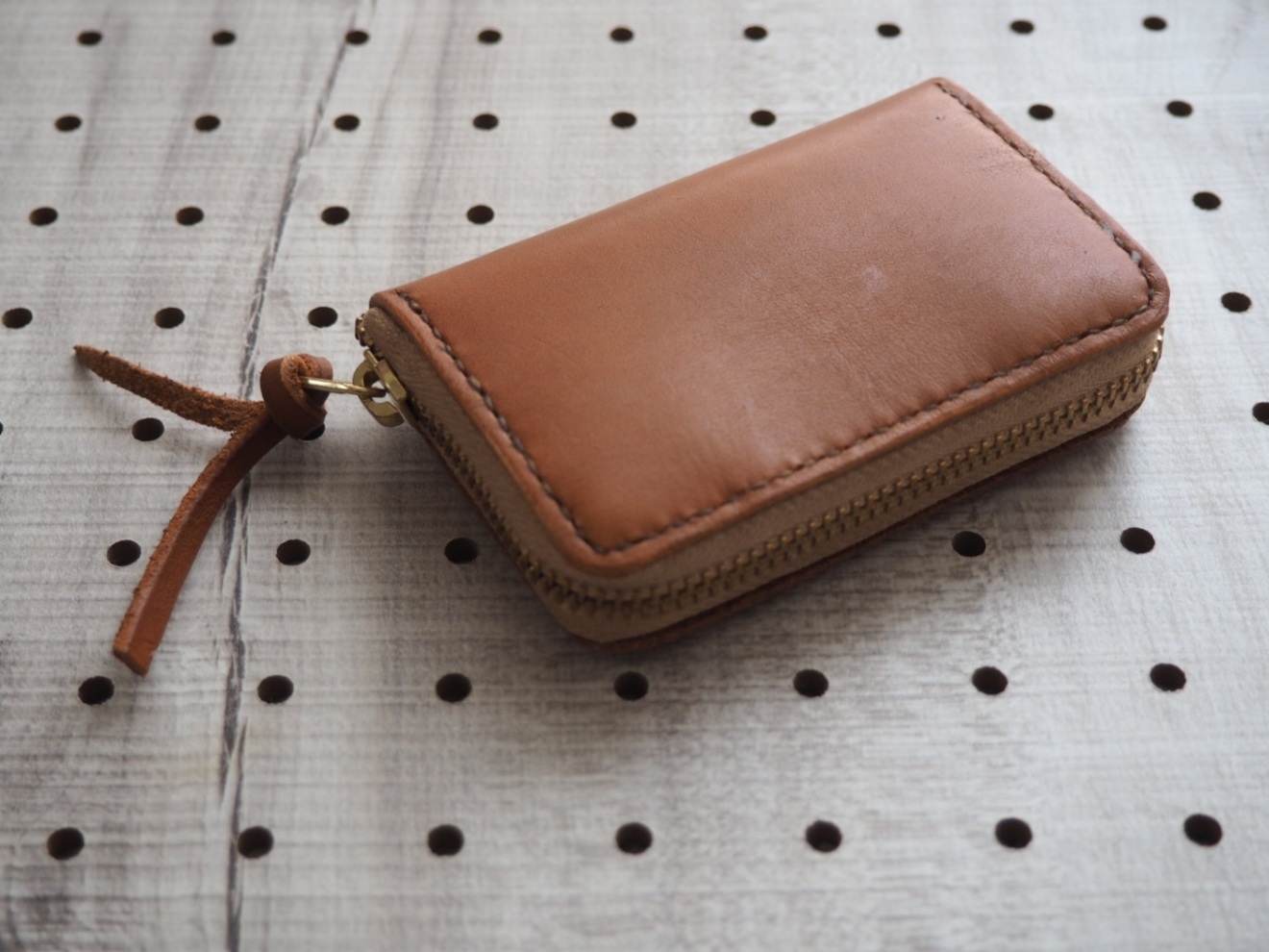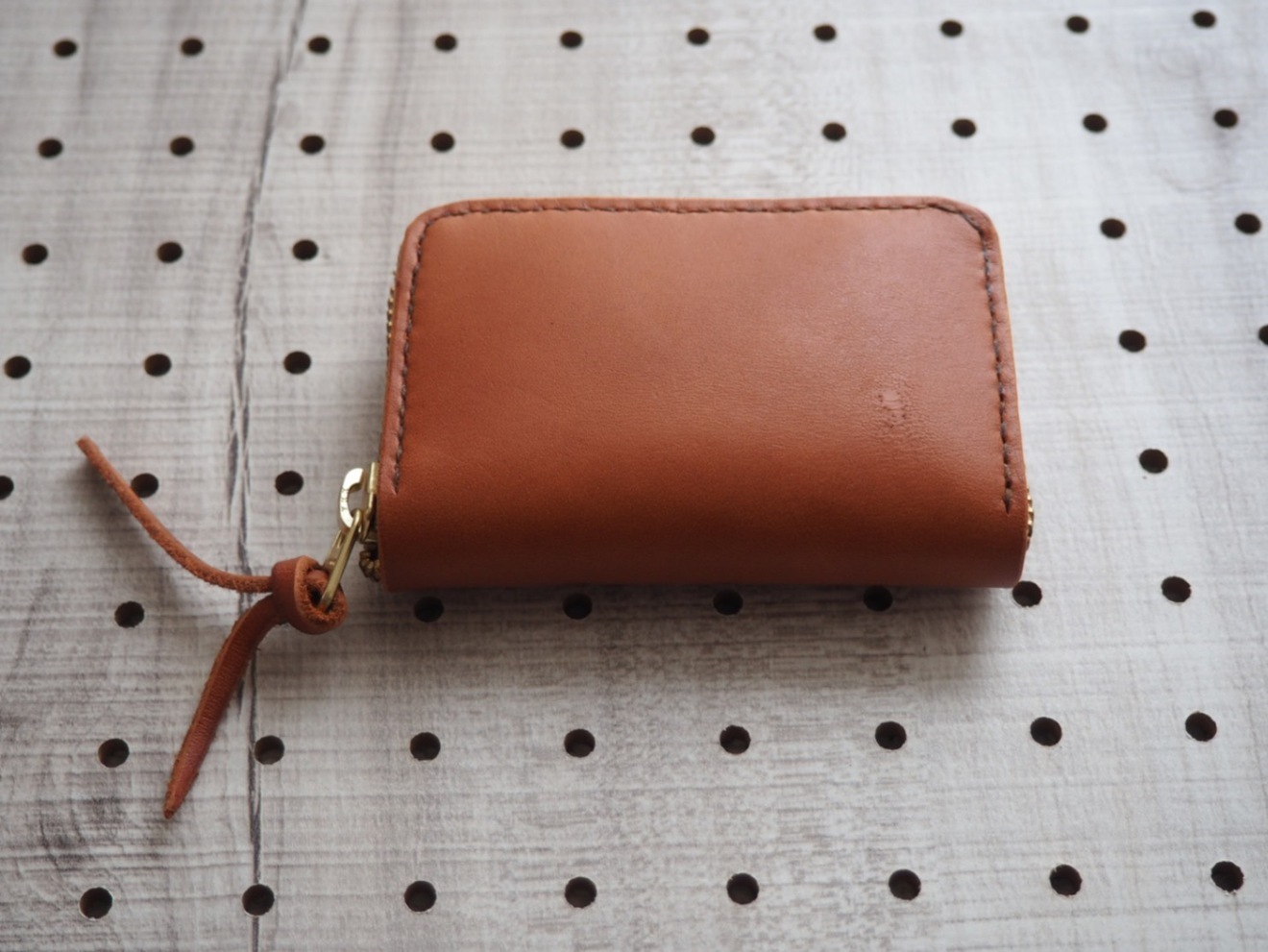 シンプルなブラウンレザーのコインケース、ゴールドジッパー付き。