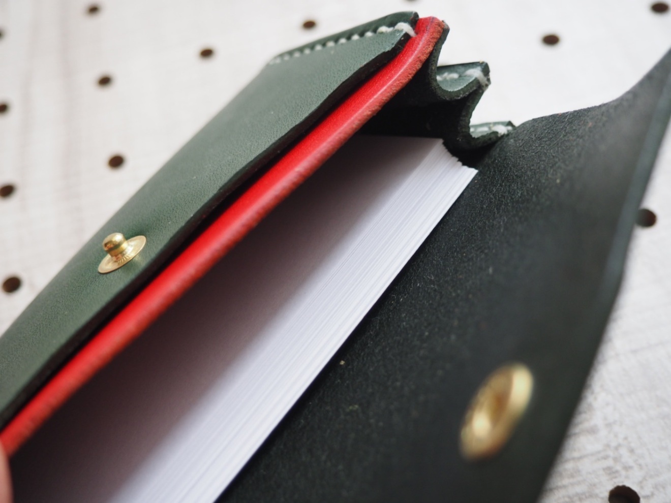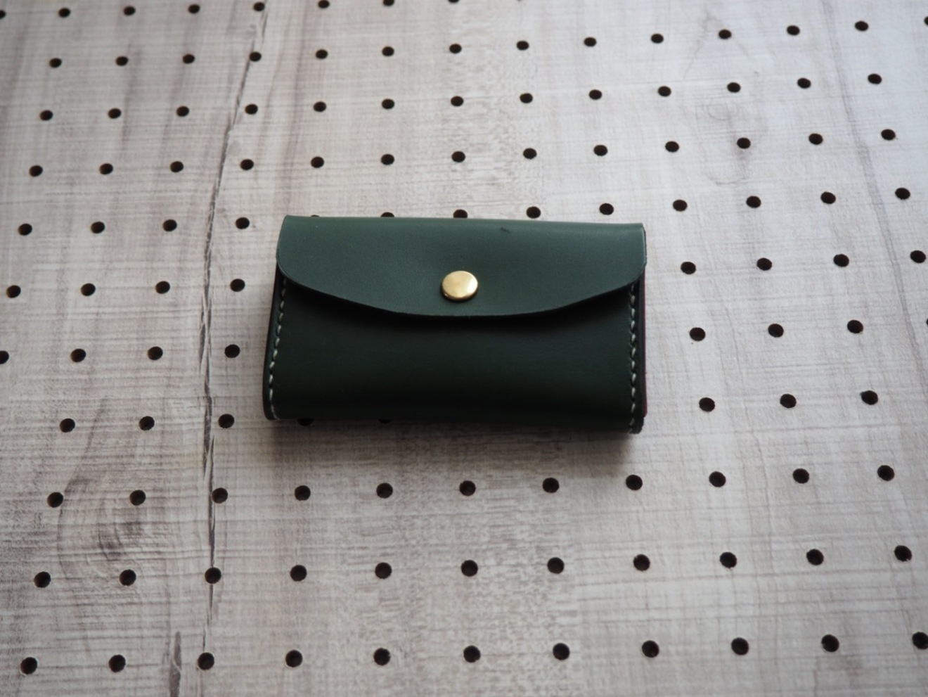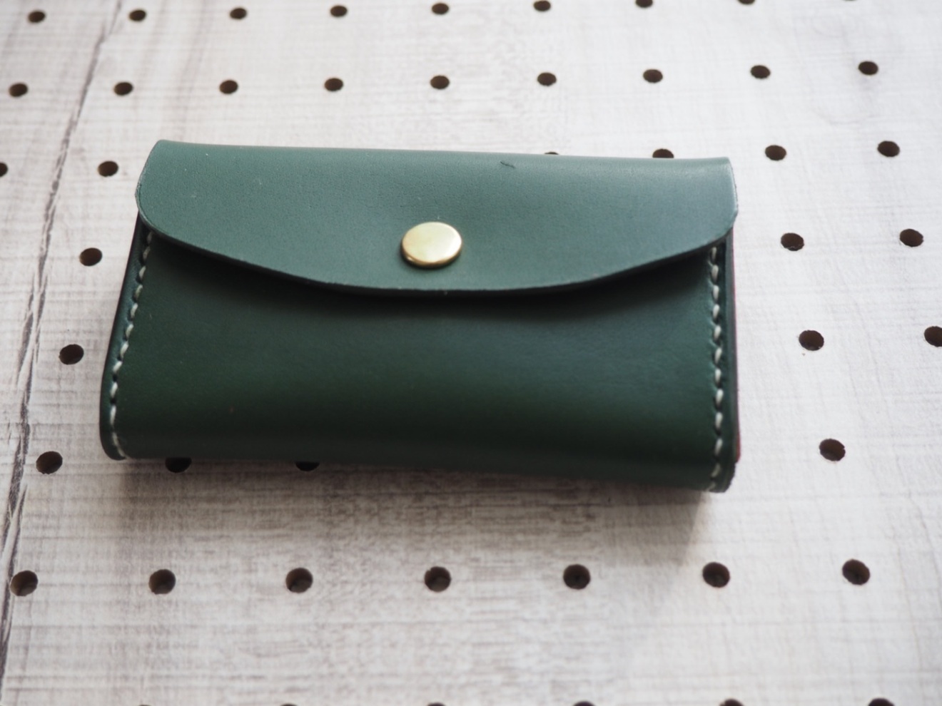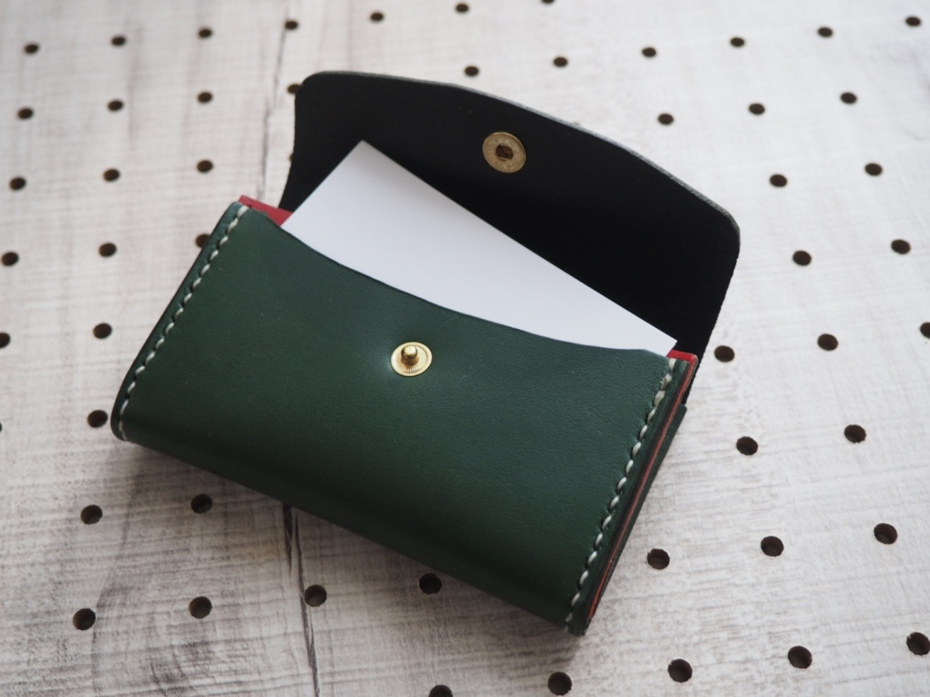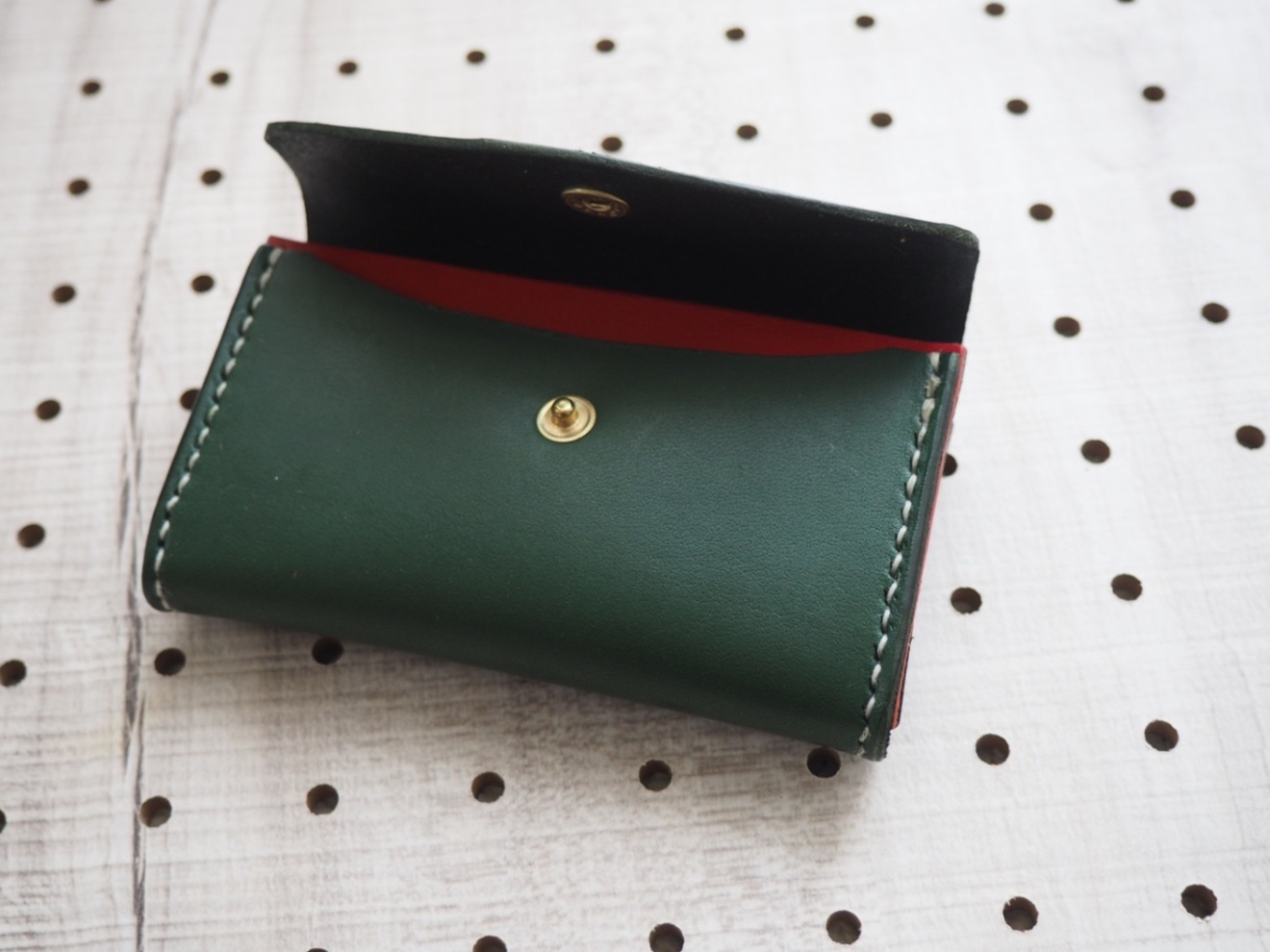 緑のレザー製カードケース、赤の内装でボタン留めのシンプルなデザイン。