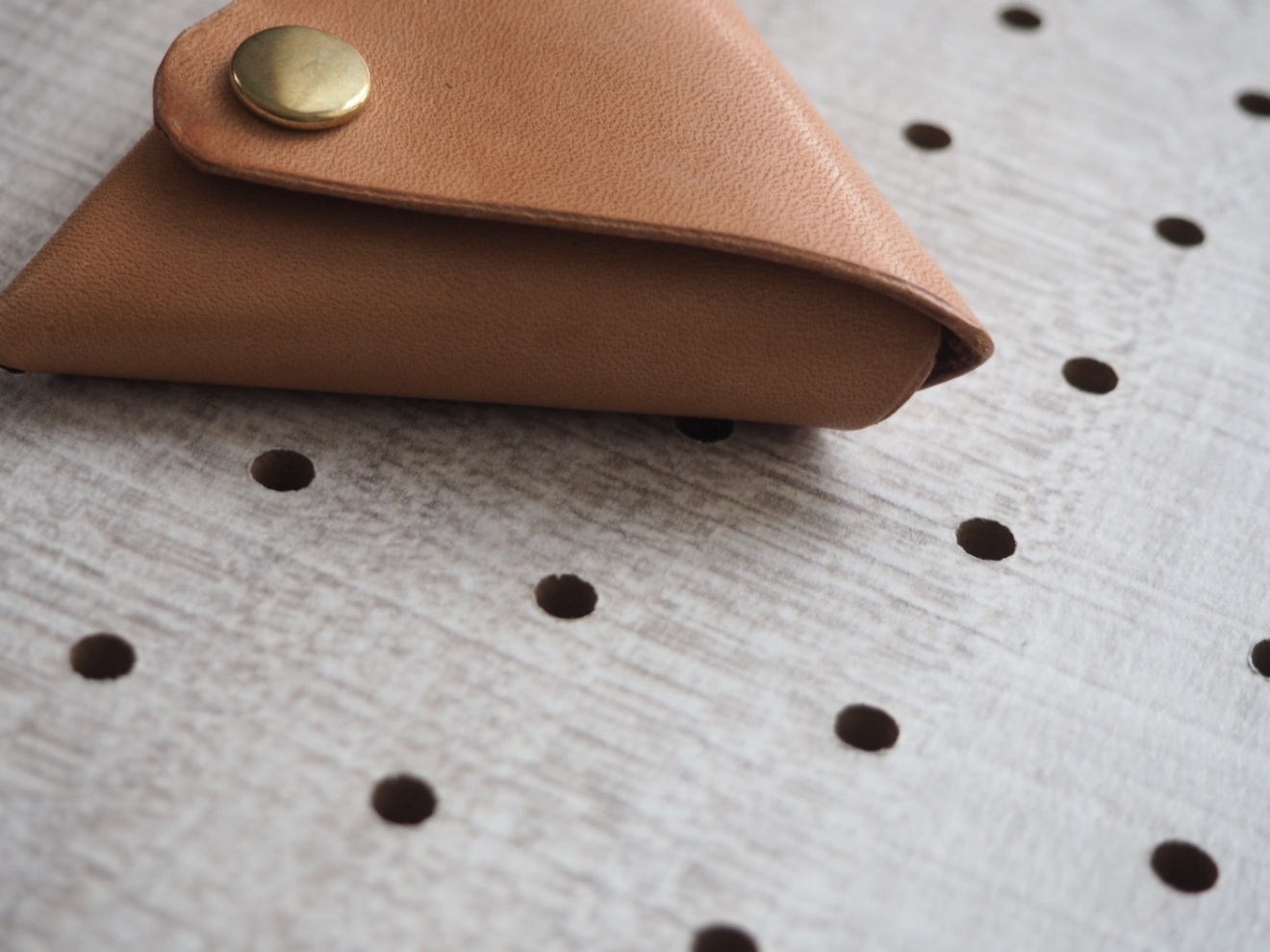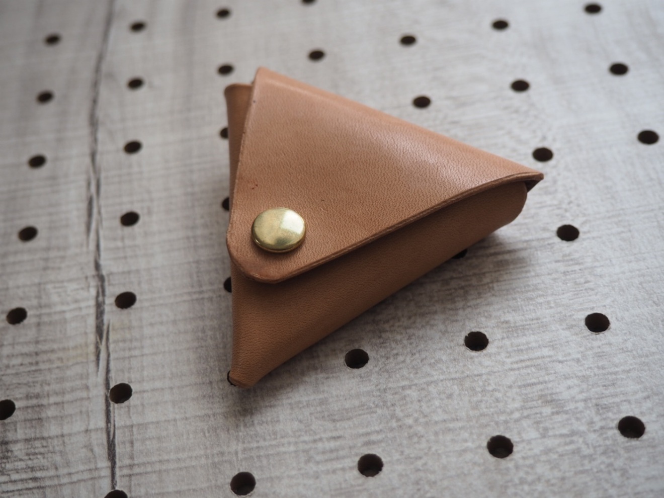 ベージュのレザー製三角形コインケース、スナップボタン付き。