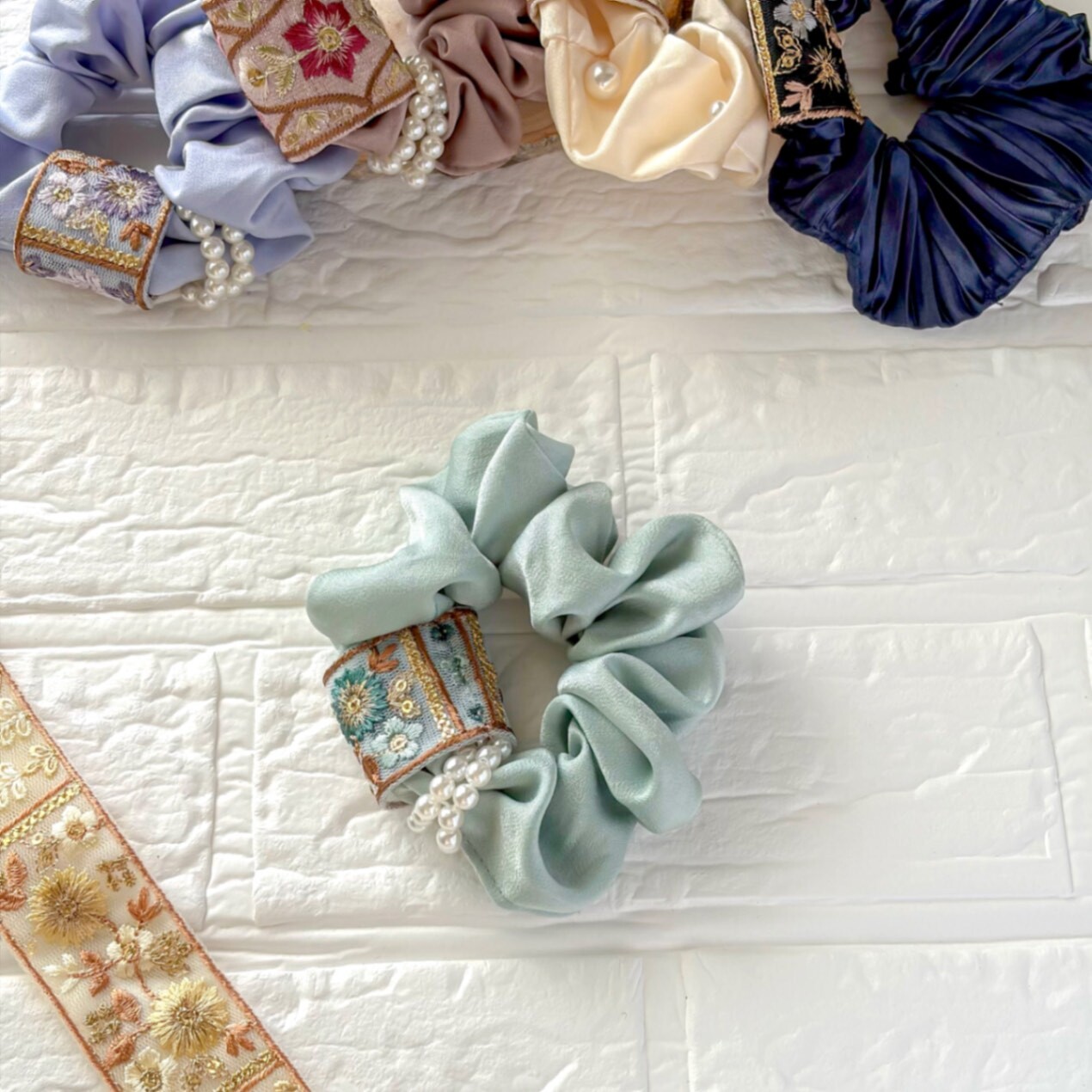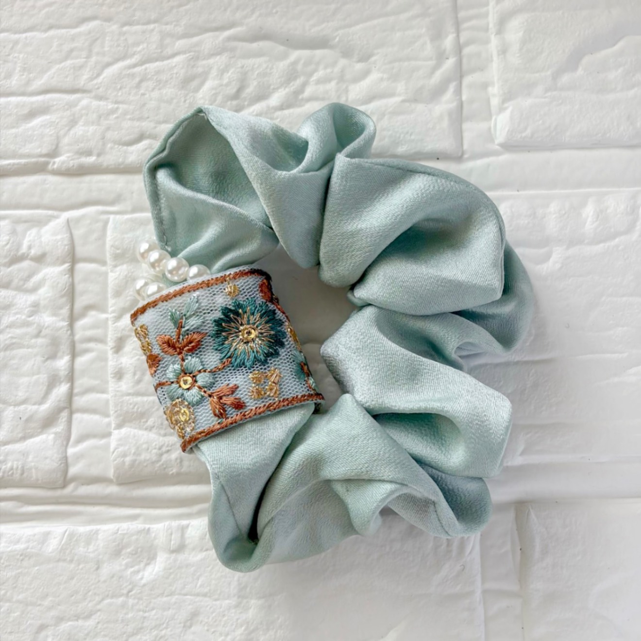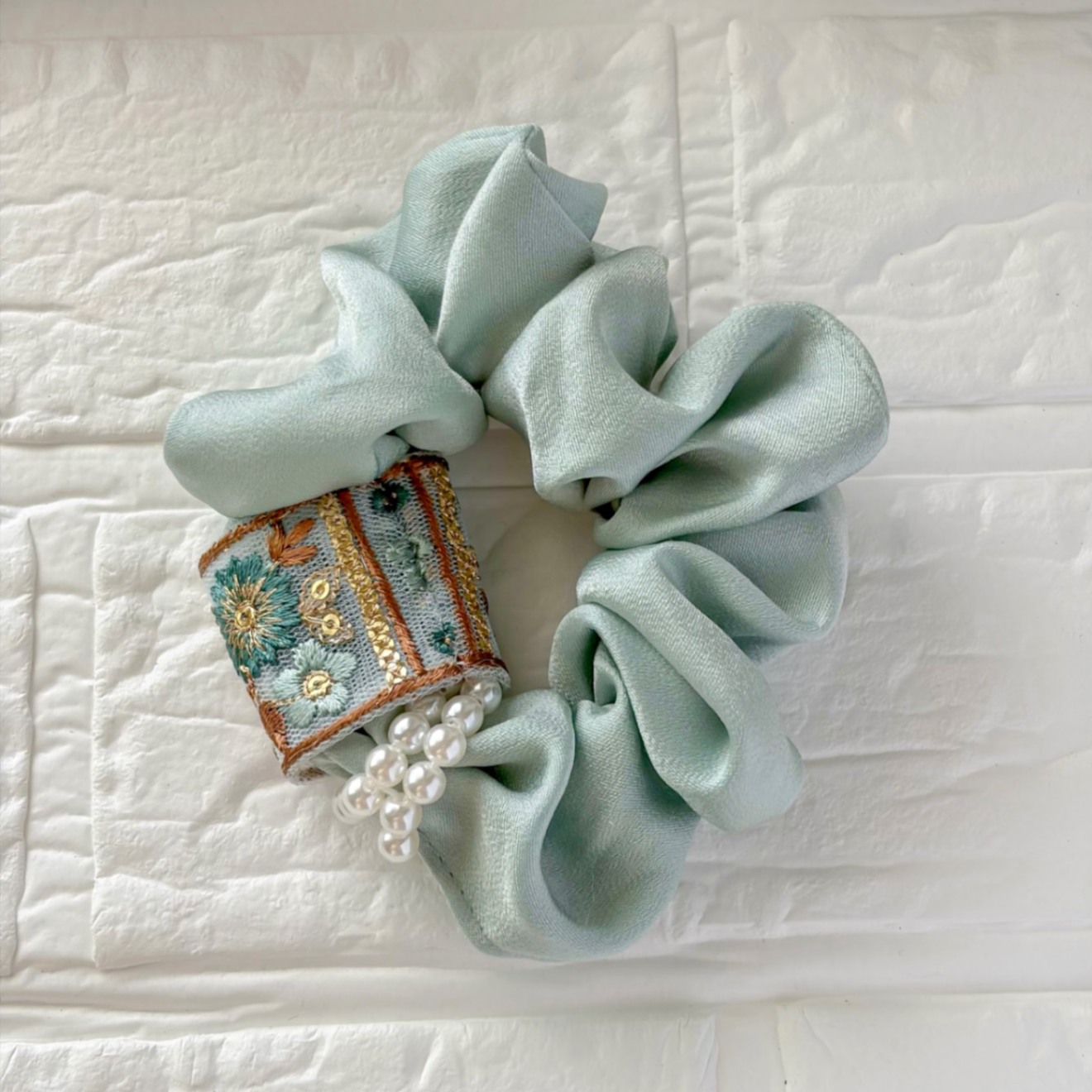 ミントグリーンの艷やかなサテン風生地に、パールとインド刺繍リボンがあしらわれたシュシュです。