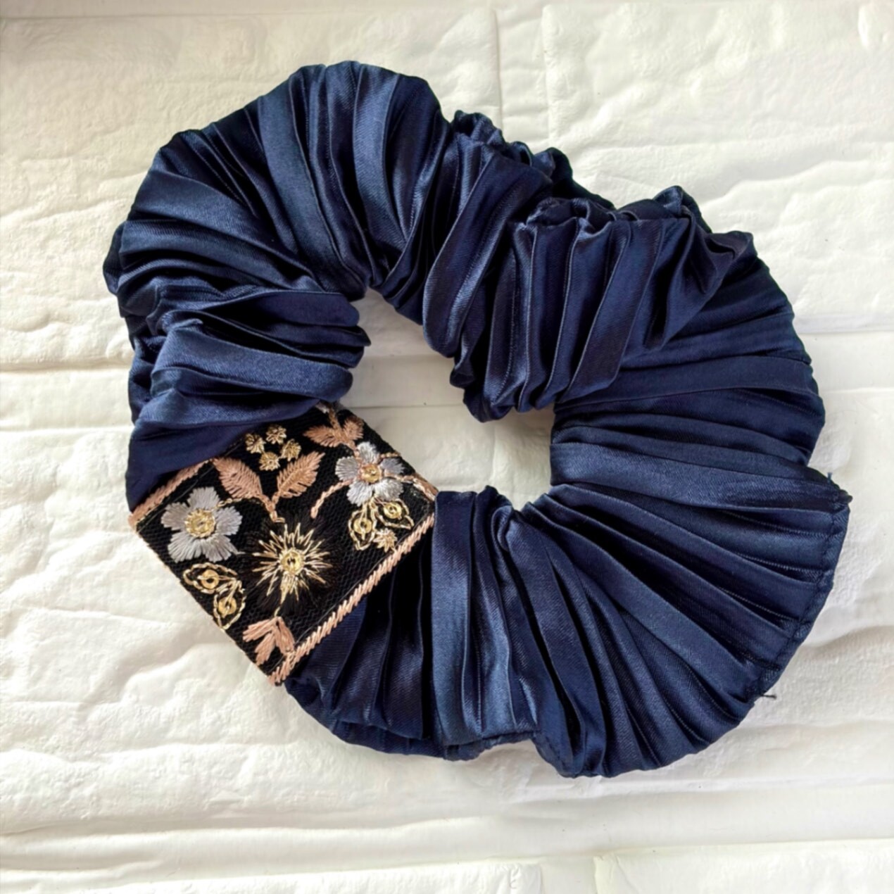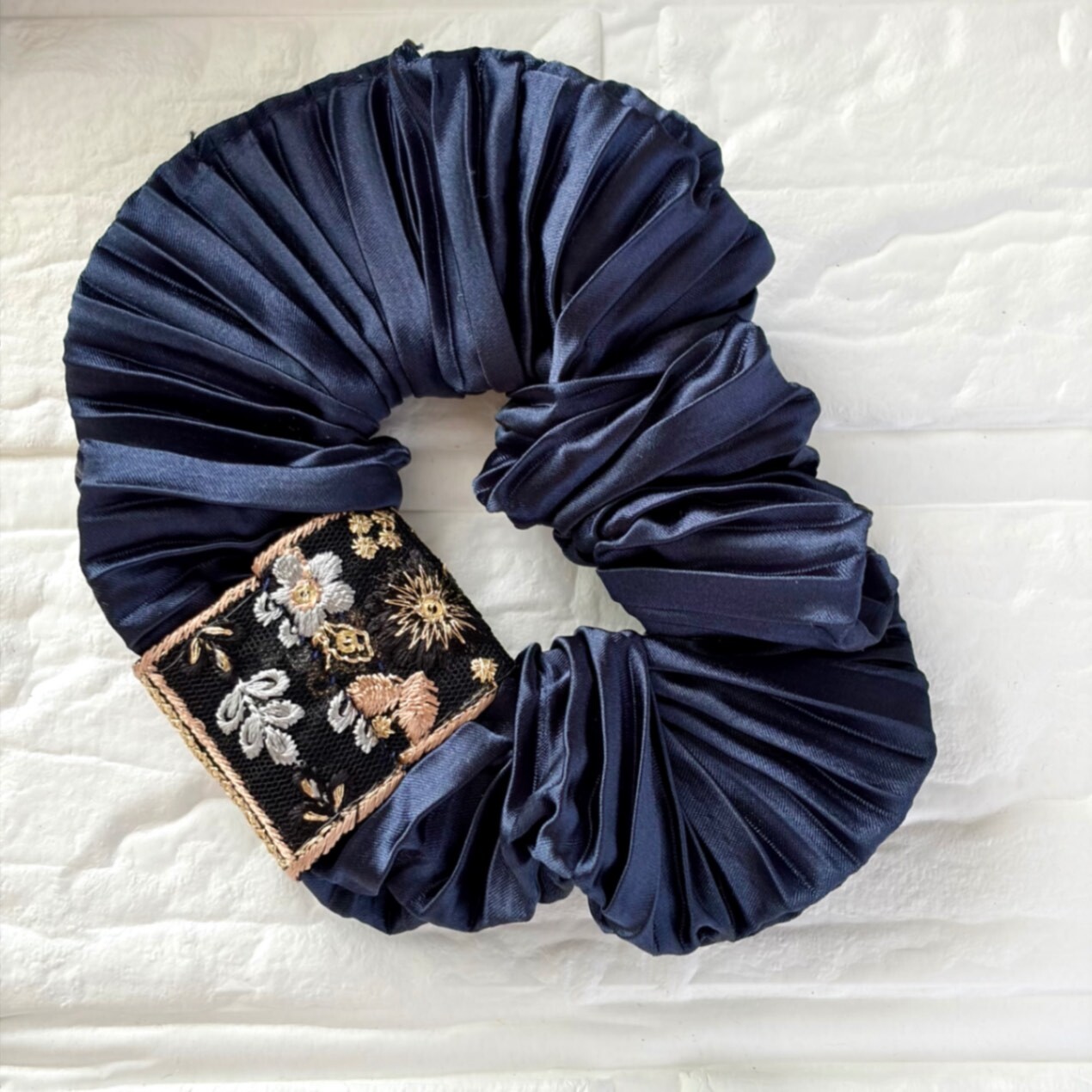 ネイビーの艷やかなサテン風生地に、パールとインド刺繍リボンがあしらわれたシュシュです。