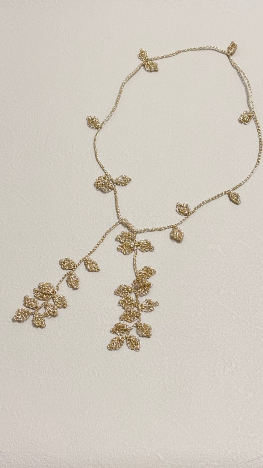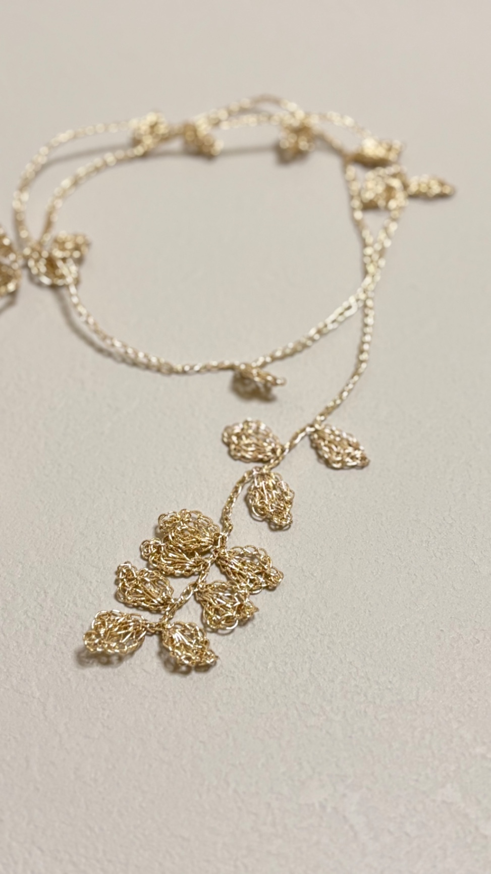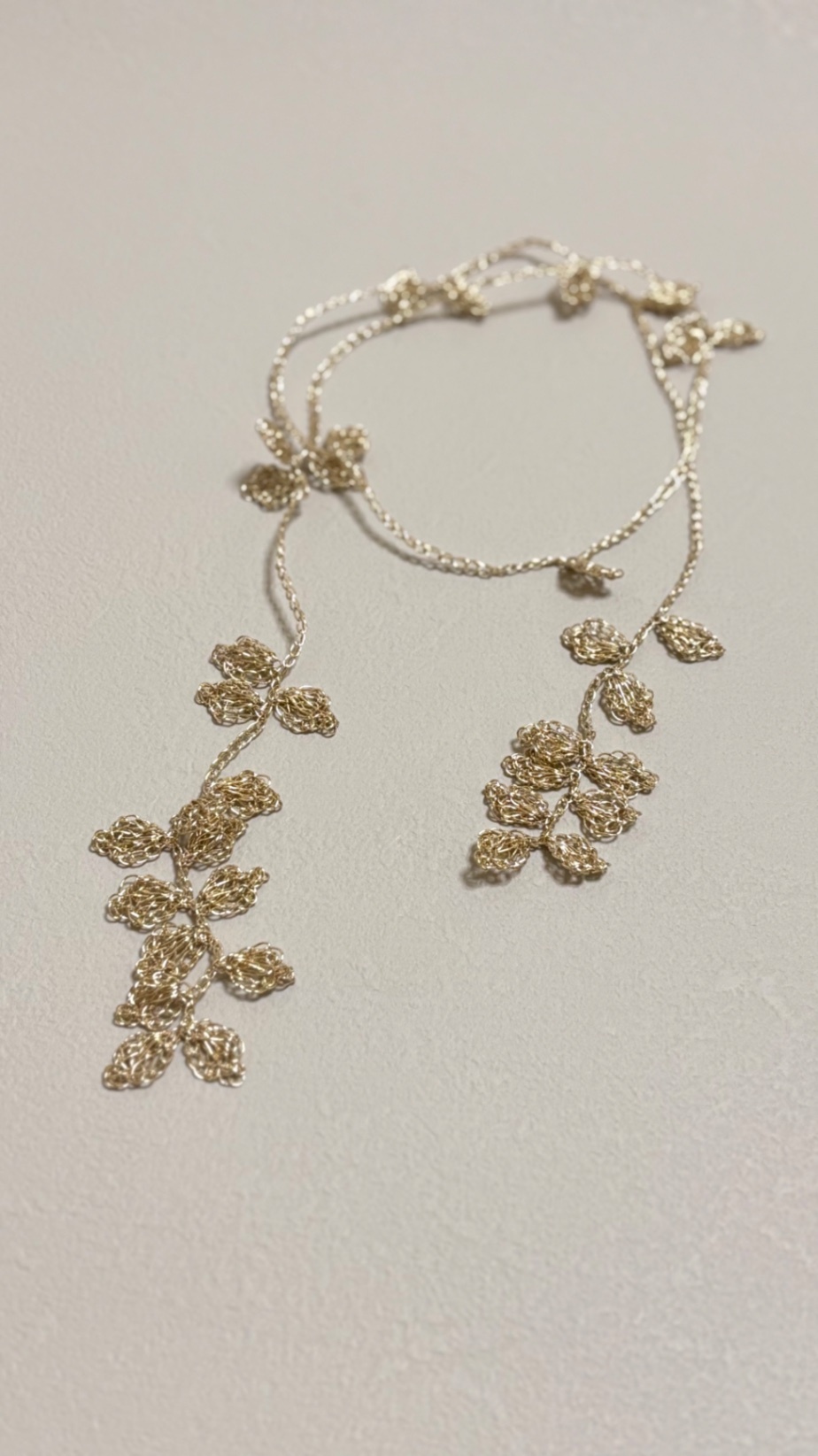 クールなシルバーカラーが胸元にさりげない華やかさを添えてくれます。