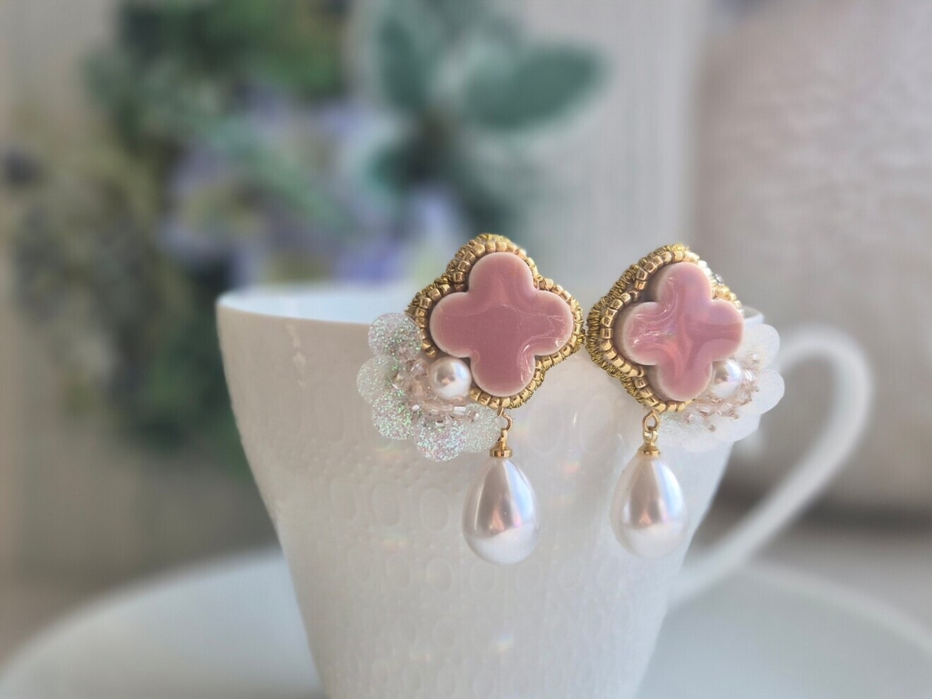 こちらはピンクの美濃焼きお花型タイルを使ったピアスになります。