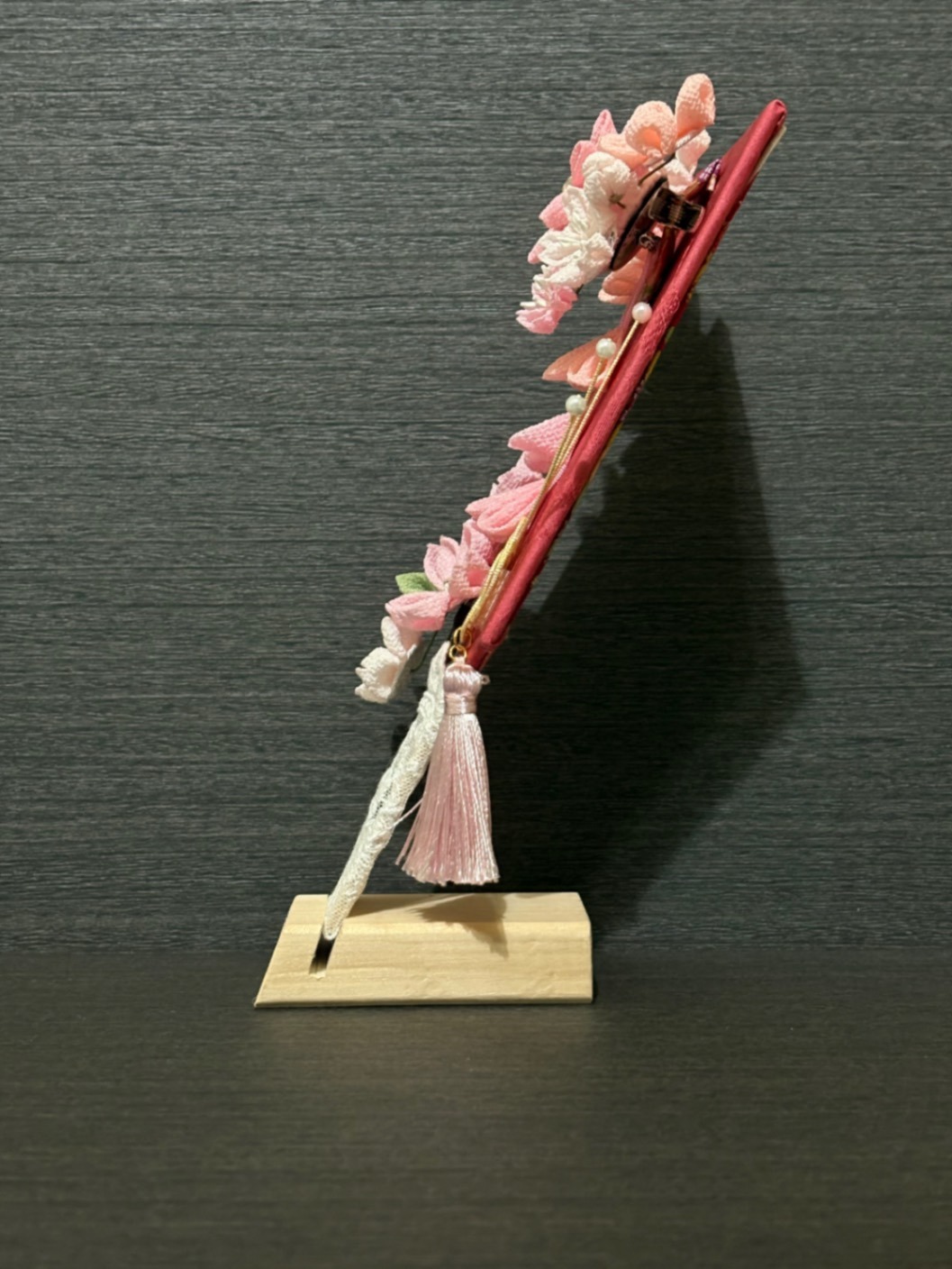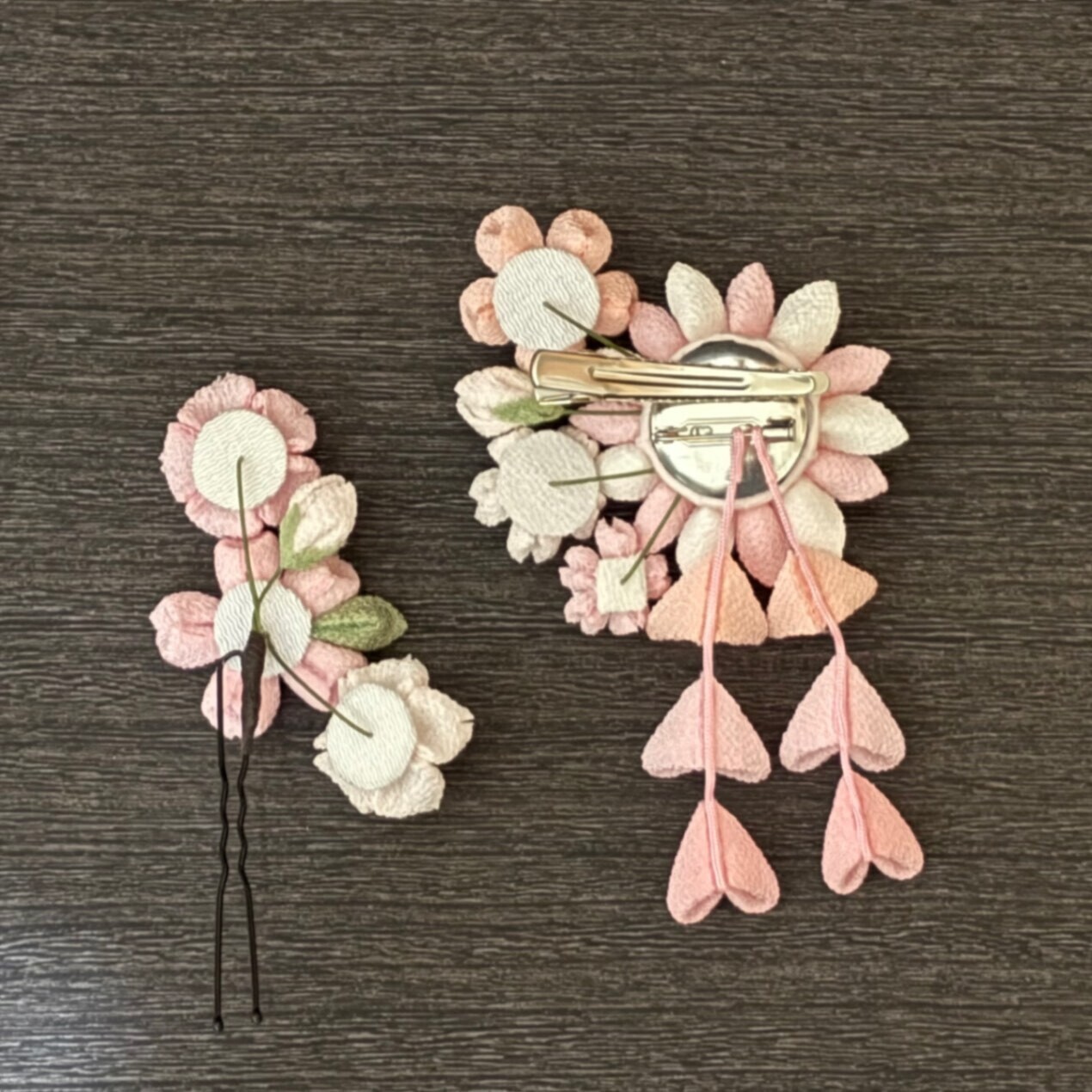 クリップ型と、Uピンタイプと、2つの髪飾りになっています。羽子板に取り付けましたので、飾っておくことが出来ます。