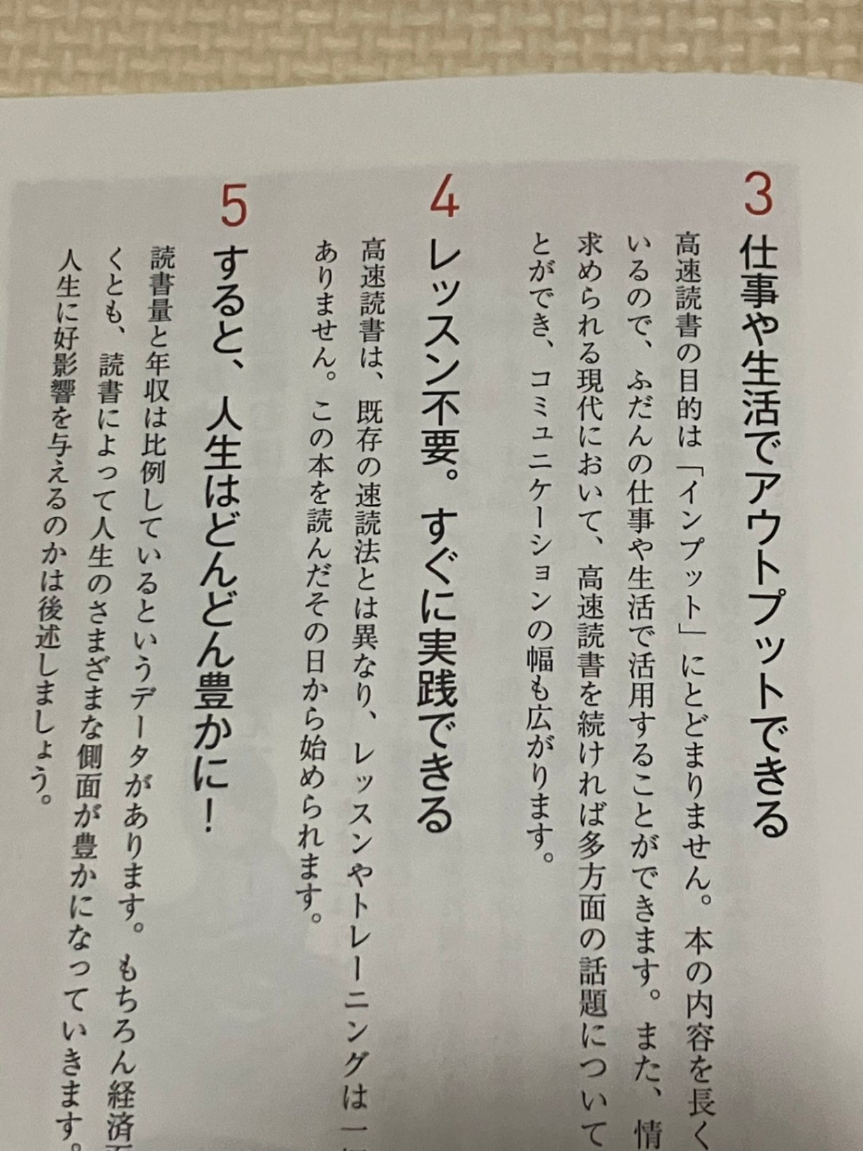 ・「分散効果」「エピソード記憶」「アウトプット」を組み合わせ、読む前の準備・1回目〜3回目の読み方・読後のアウトプットノート作りまで、具体的な高速読書の手順を示している。