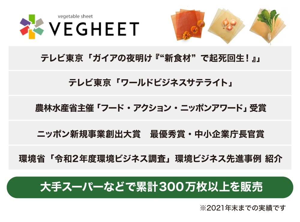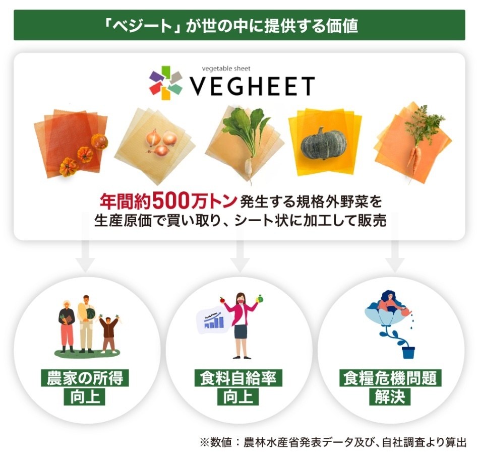 VEGHEETは長年の研究の末に完成した製法で、野菜の「おいしさ」そのままシート状にすることに成功しました。原材料は野菜と寒天のみ。ベースト状にした野菜と寒天から作られるシートには栄養分が凝縮され、植物繊維も豊富です。VEGHEETで使用する野菜は、傷入りやサイズ違いといった、規格外野菜になります。味や栄養は変わらないのに、破棄されていた野菜を活用しています。