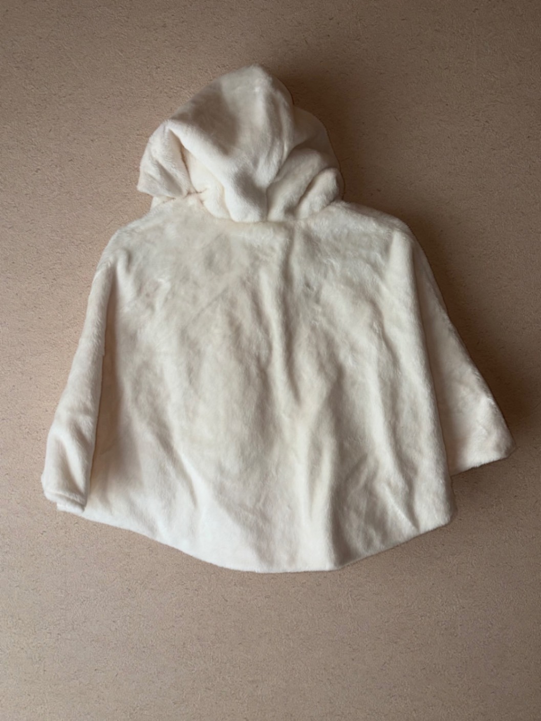 ミキハウスファースト(MIKI HOUSE FIRST)のベビーポンチョです。 真っ白で柔らかな肌触りのフェイクファーに、お耳のついたフードとうさぎの刺繍がとっても可愛いデザインです。