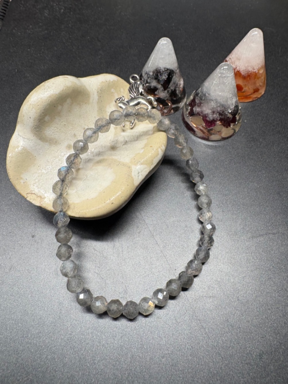 また、ラブラドライトは直感力や洞察力を高め、スピリチュアルな能力を強化するとも言われています。変化や挑戦の時期に心の強さをサポートし、守護の力でネガティブなエネルギーから持ち主を守る効果も期待できます。新しい一歩を踏み出したい方や、内なる力を引き出したい方におすすめの石です。