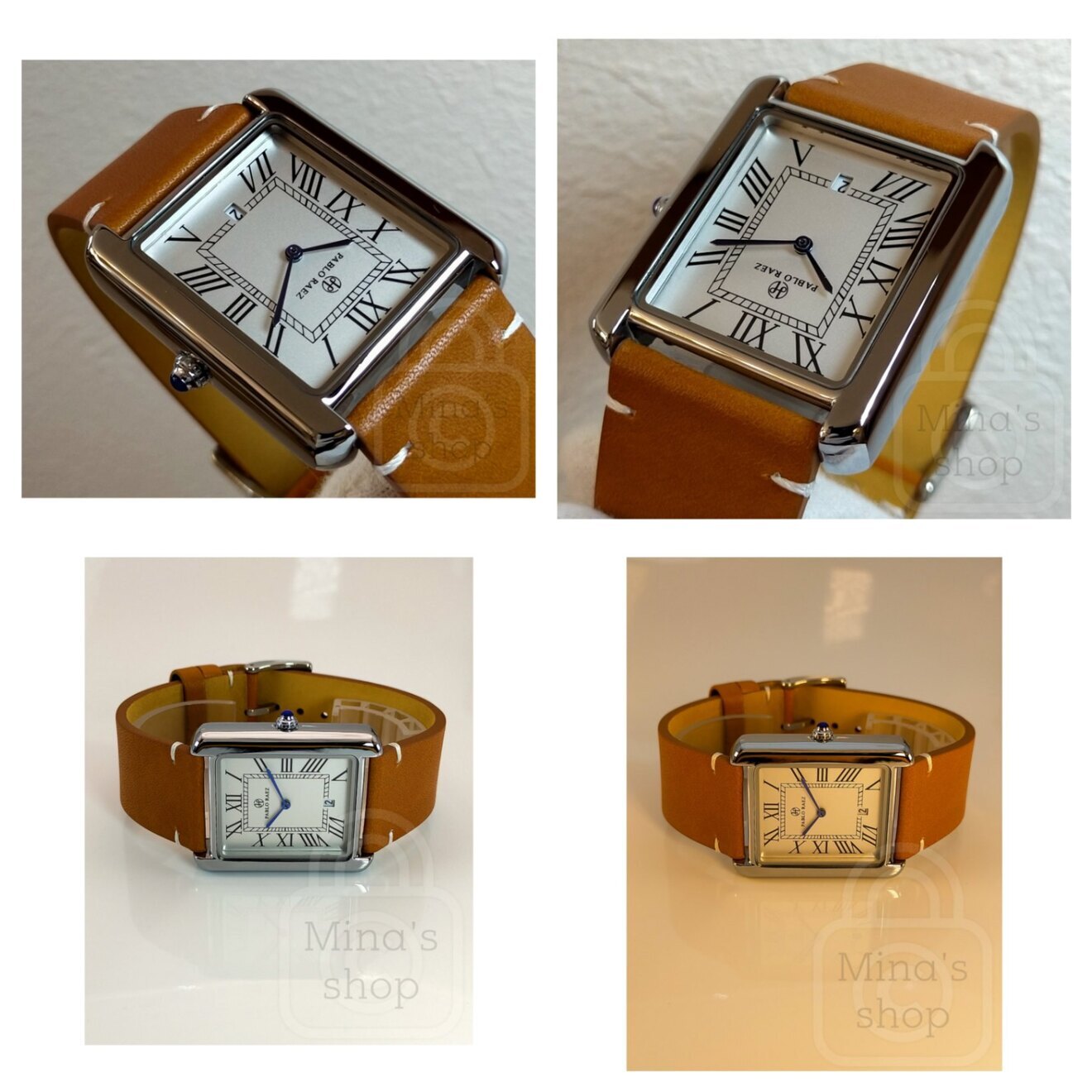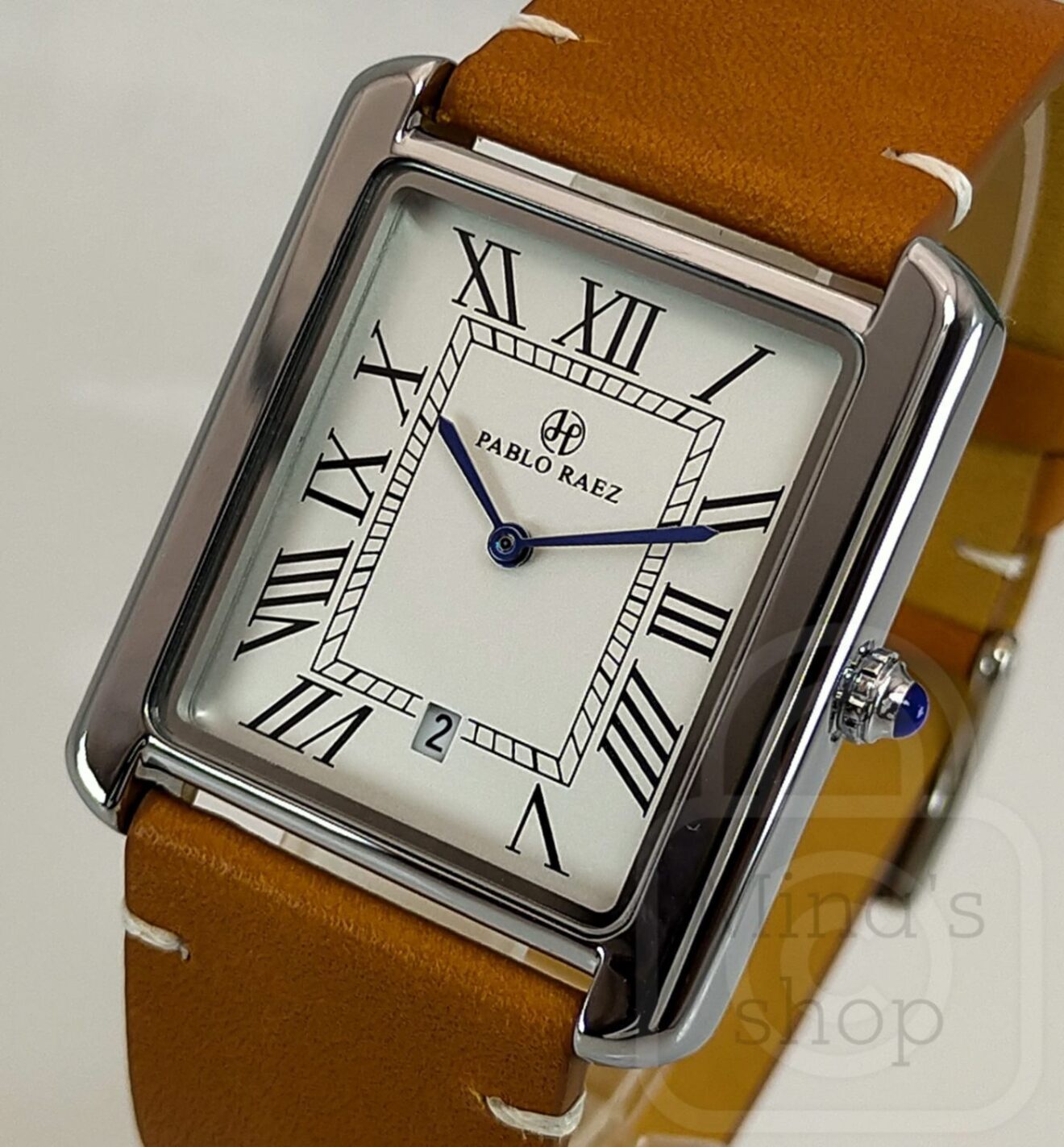 【大人の為のスタイルレクタングル/新品】日付 パールホワイト文字盤/カーフスキンブラウン革 メンズ