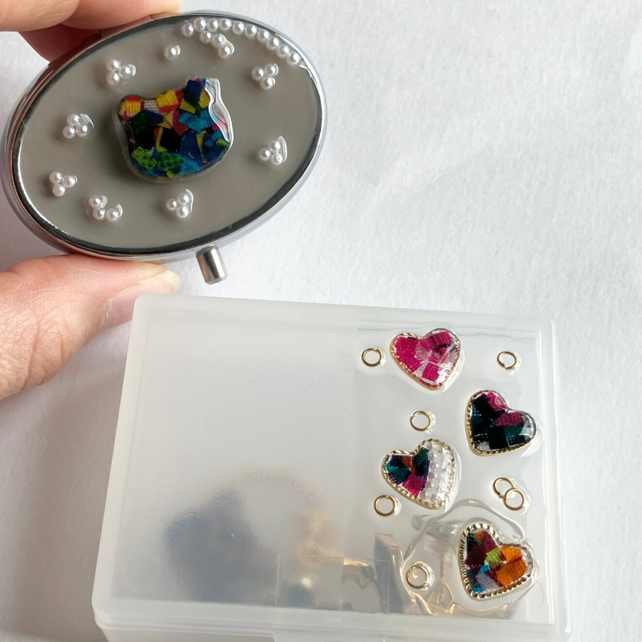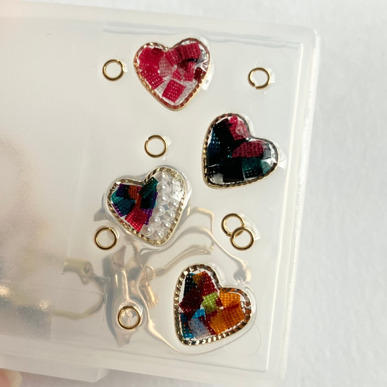 ・アフリカ布のハギレを閉じ込めた4つのハートとキラッと輝くゴールドの丸が可愛くなりすぎない大人可愛い一点もの