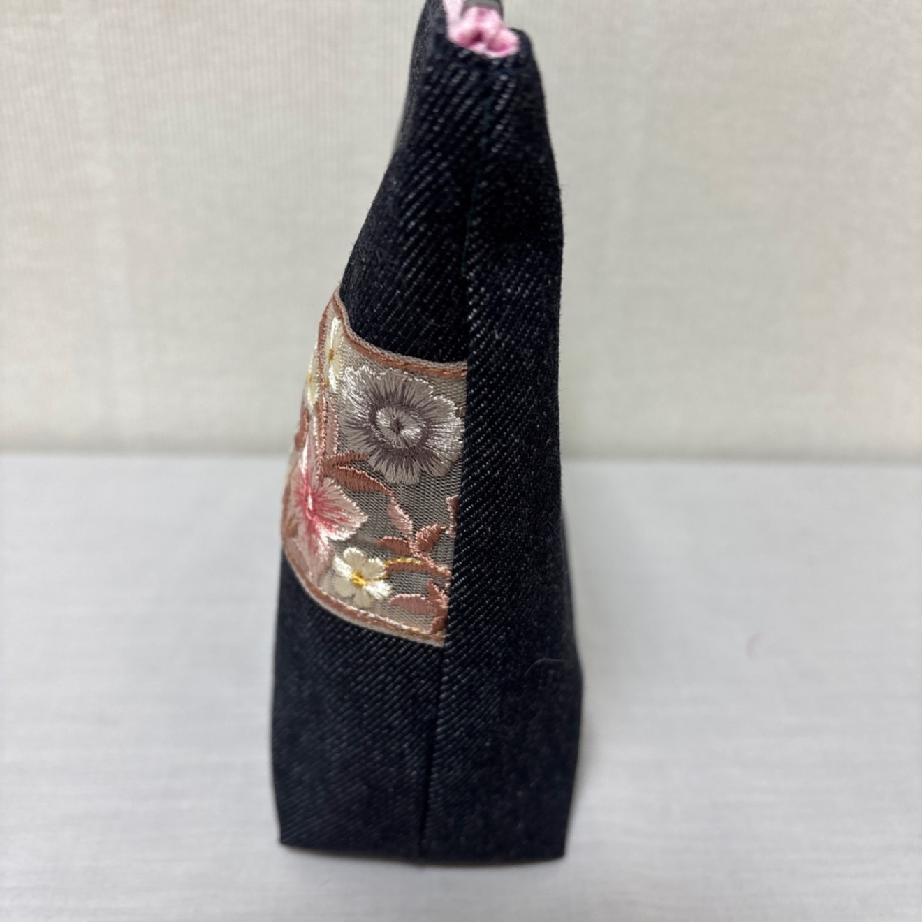 デニムにインド刺繍リボンをデニム生地に、上品な花柄の刺繍リボンを合わせたハンドメイドポーチです。