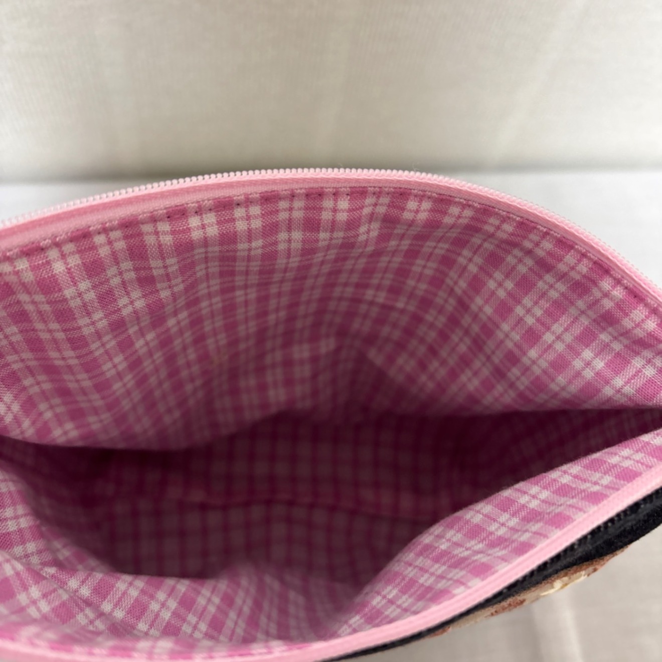 内布はやさしいピンクのチェック柄で、ファスナーを開けるたびに気分が明るくなります。