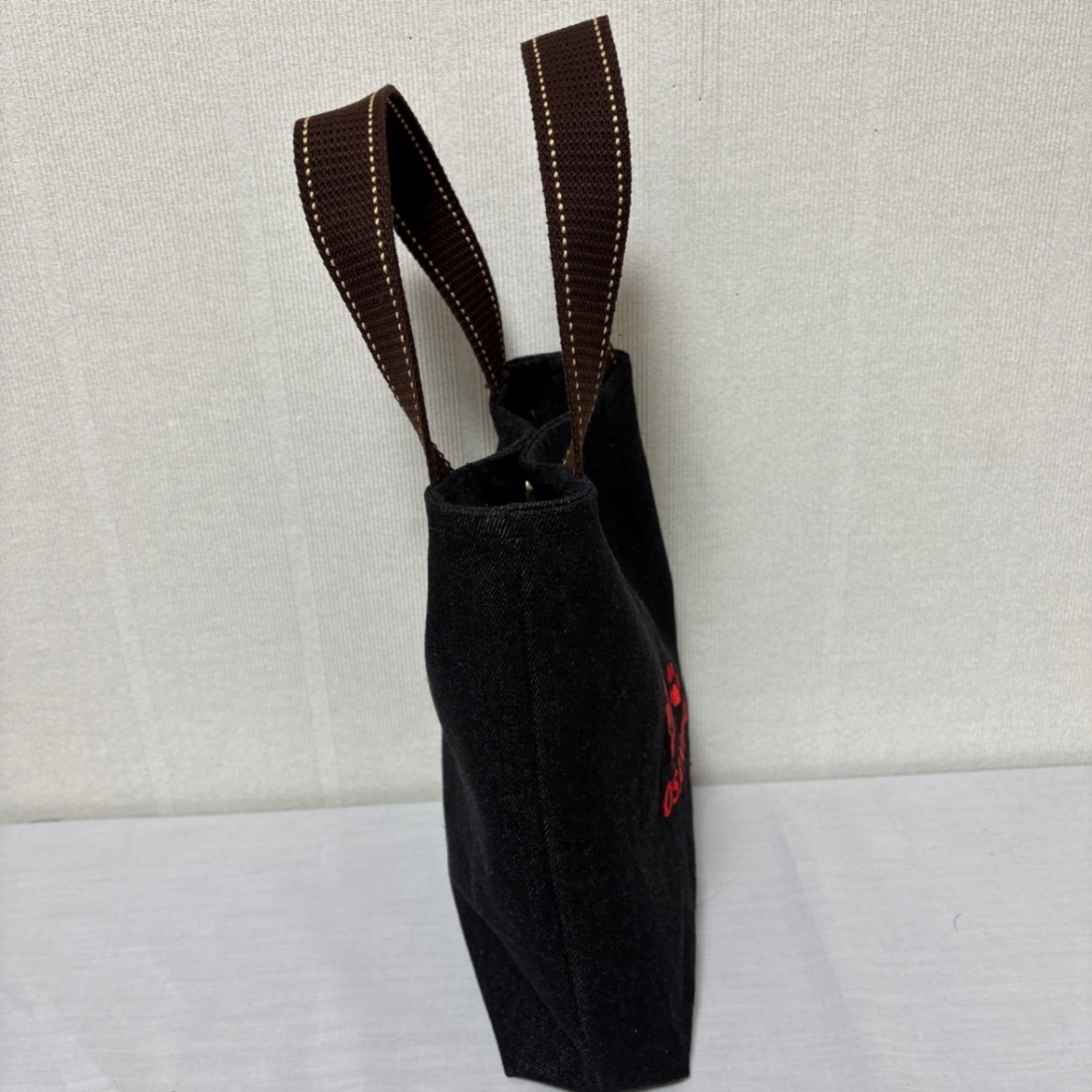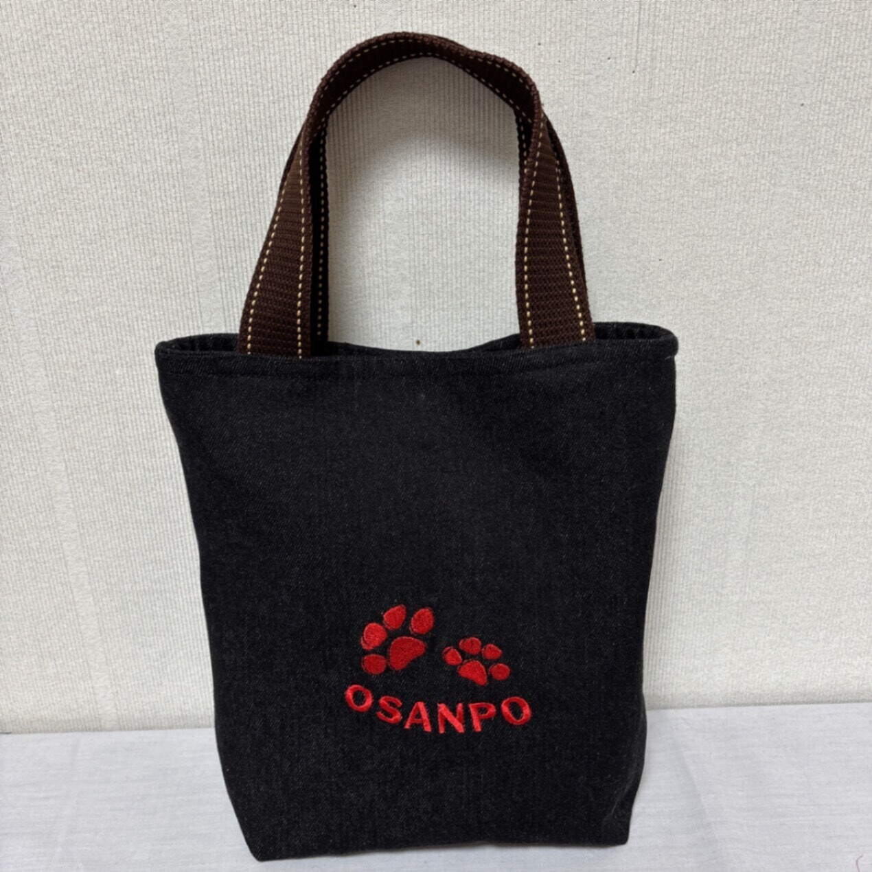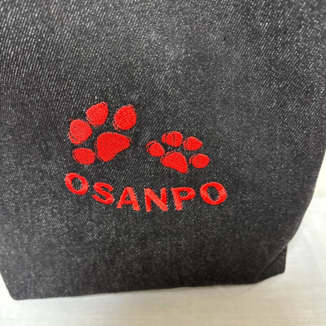 シンプルデニム生地に、赤い肉球と「OSANPO」の刺繍がポイントのミニトートバッグです。