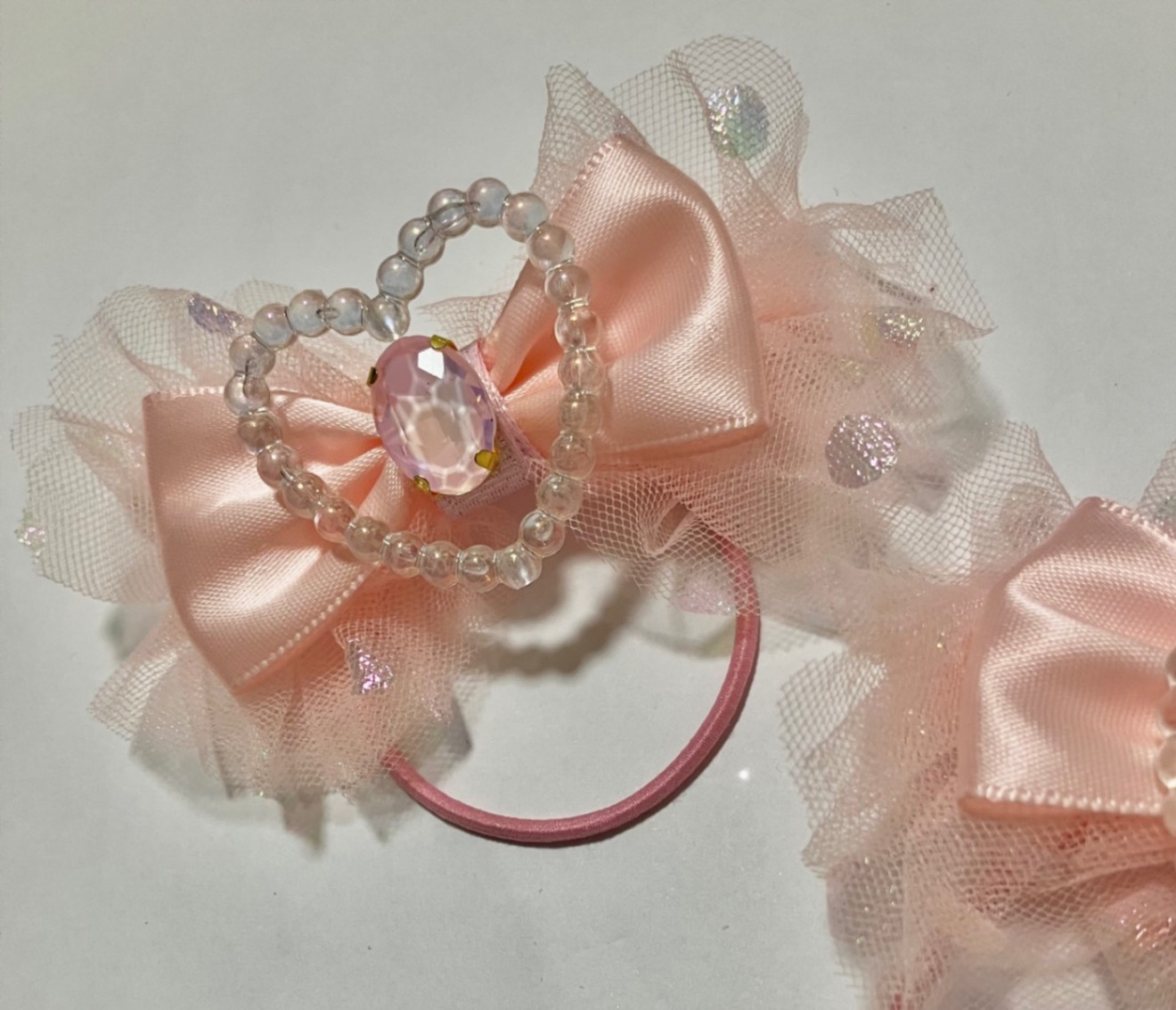 優しいベビーピンクのサテンリボンと、フリルをたっぷりあしらったチュールが重なり合った、ロマンチックなヘアゴムの2個セットです。