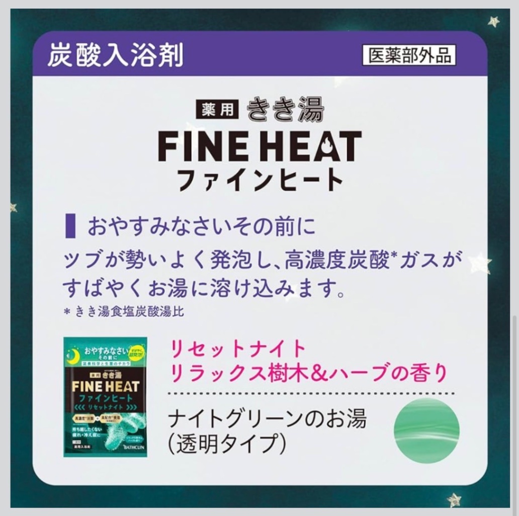 ●きき湯ファインヒート リセットナイト:リラックス樹木&ハーブの香り/ナイトグリーンのお湯(透明タイプ)